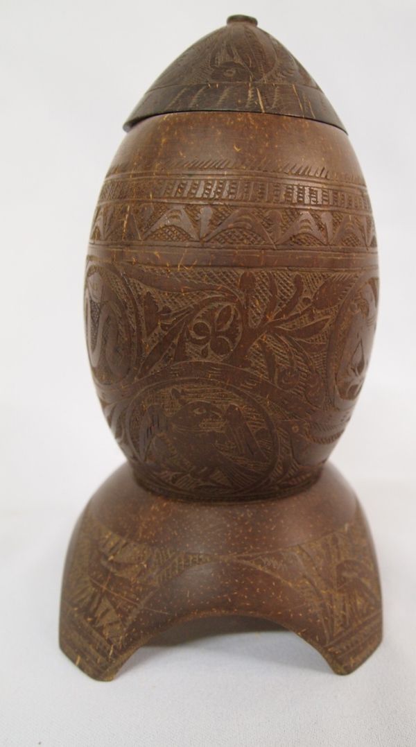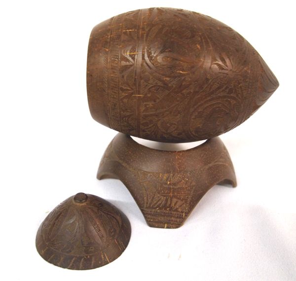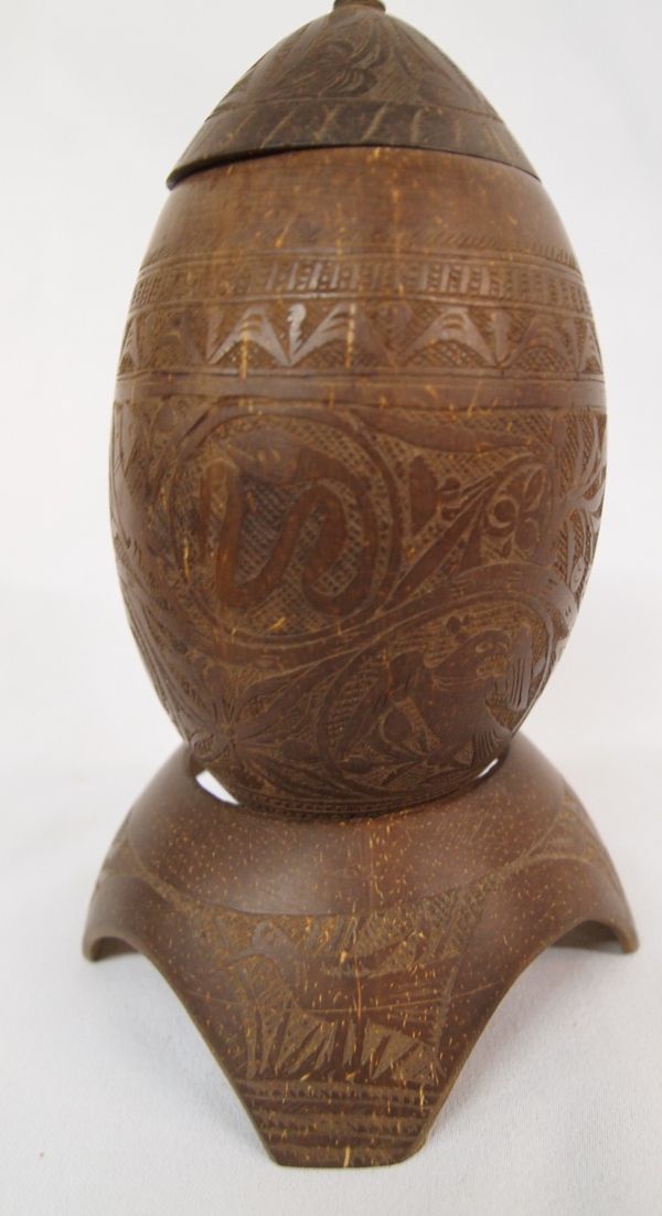 Coconut Shell Carving, Stand and Vessel With Top. Carved all over coconut shell vessel with base. Corinto Nicaragua, Central America.