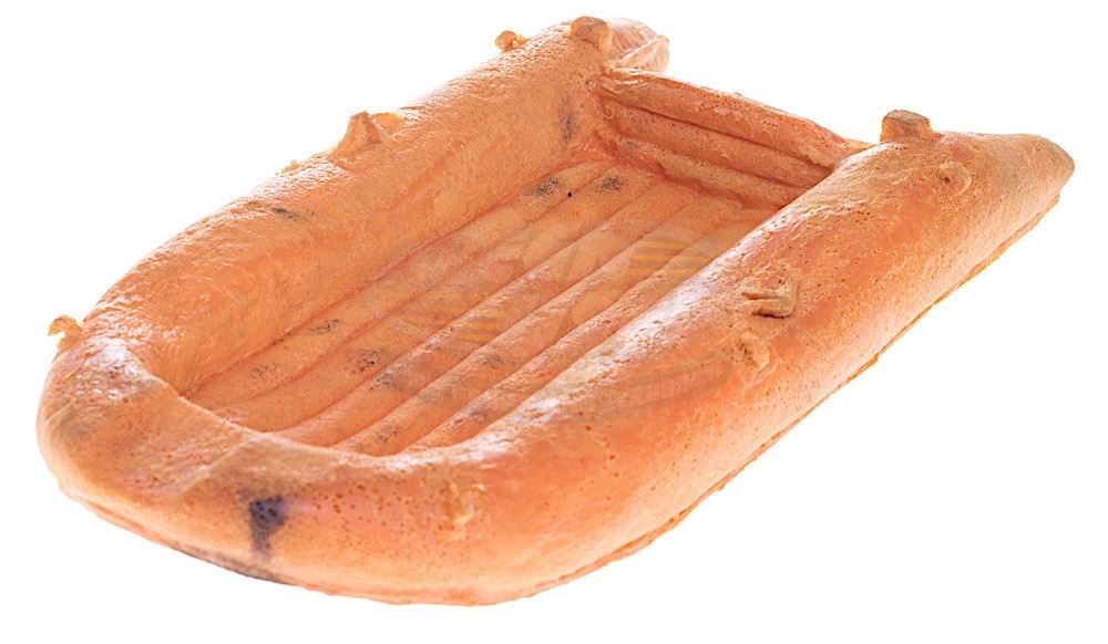 (20th Century Fox, 1985) This miniature raft was custom-made by the production for use during filming of the miniature effects sequences of the film. The raft is made of orange colored foam and measures 12" x 6" x 1.75". Wear from use and storage is present.