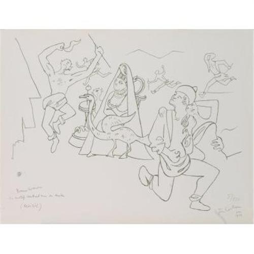 Notes:Original lithograph by Jean Cocteau from the drawings for the Chapelle of Ville franche sur Mer. The lithograph on Arches paper measures 20 x 25 inches. It is mint condition, never framed and stored flat. Signed in the plate. The print reeads Bonne version du otif central mur de droite (Maririe). Signed in the plate Jean Cocteau 1956, numbered #5/150 and initialized Fernand Mourlot in green pencil.