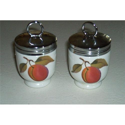 Featured today, is a MINT IN BOX, Royal Worcester, set of matched Coddlers. The box is blue in color with a tiny yellow thread tied to the back. The inside lid opens and gives the directions on how to use the Coddlers. Silver toned screw type lids with round handles. The coddlers are decorated with peaches and berries. Bottom of both coddlers are stamped with the Royal Worcester Emblem and ROYAL WORCESTER-FINE PORCELAIN-MADE IN ENGLAND-OVEN TO TABLEWARE. Both of the coddlers are mint in box.