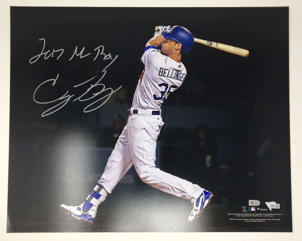 Photo measures 16" x 20" in size. Hand-signed and inscribed in silver paint pen by Cody Bellinger.