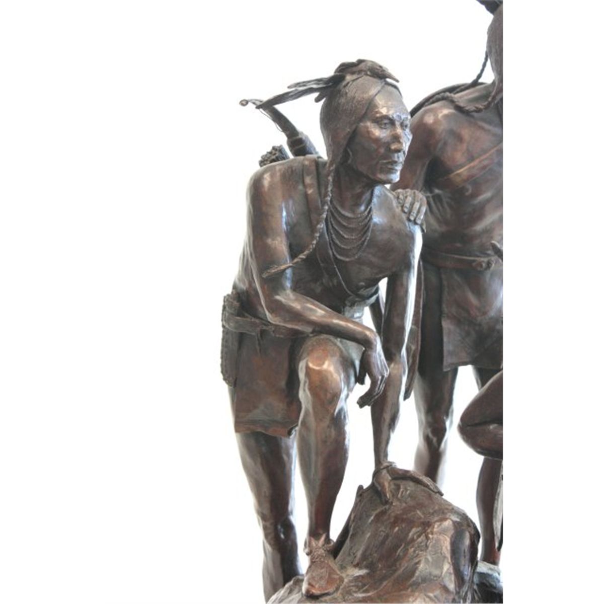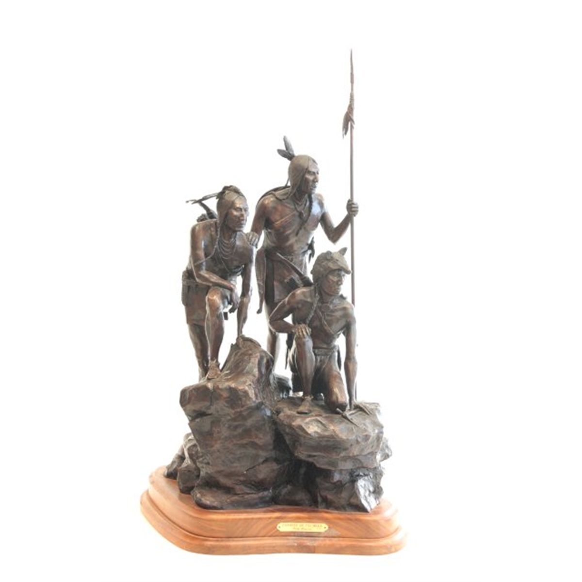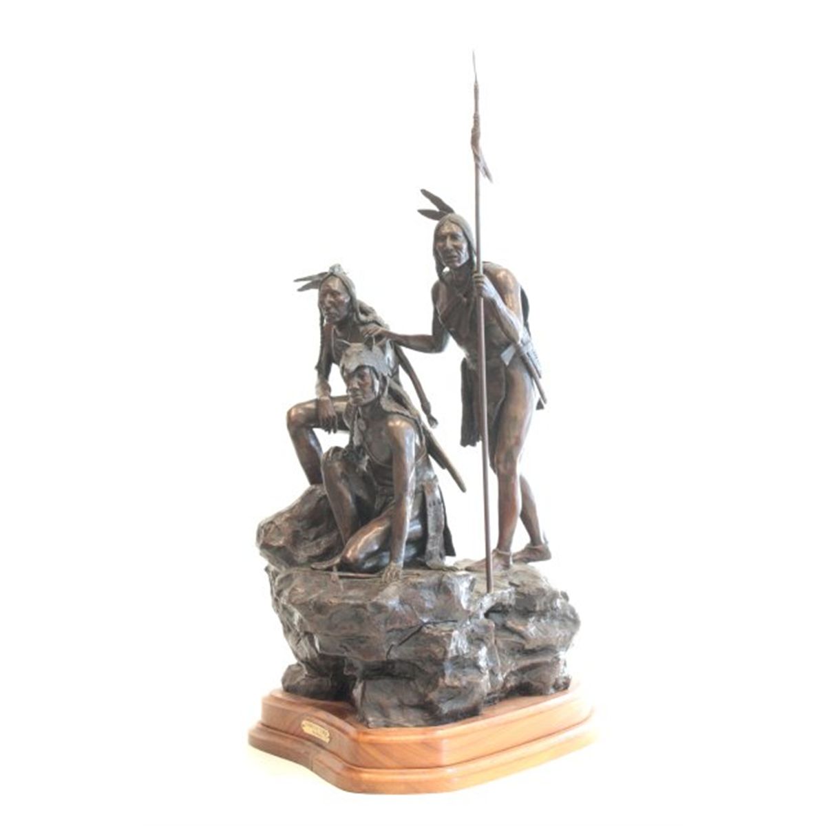 Cody Houston (20thc American) "Changes in the Wind" bronze group of three Native American Braves standing on a rock, 27" high x 12" wide x 16" deep, signed Cody Houston, dated 1989, foundry stamp, on wood base 30" high overall