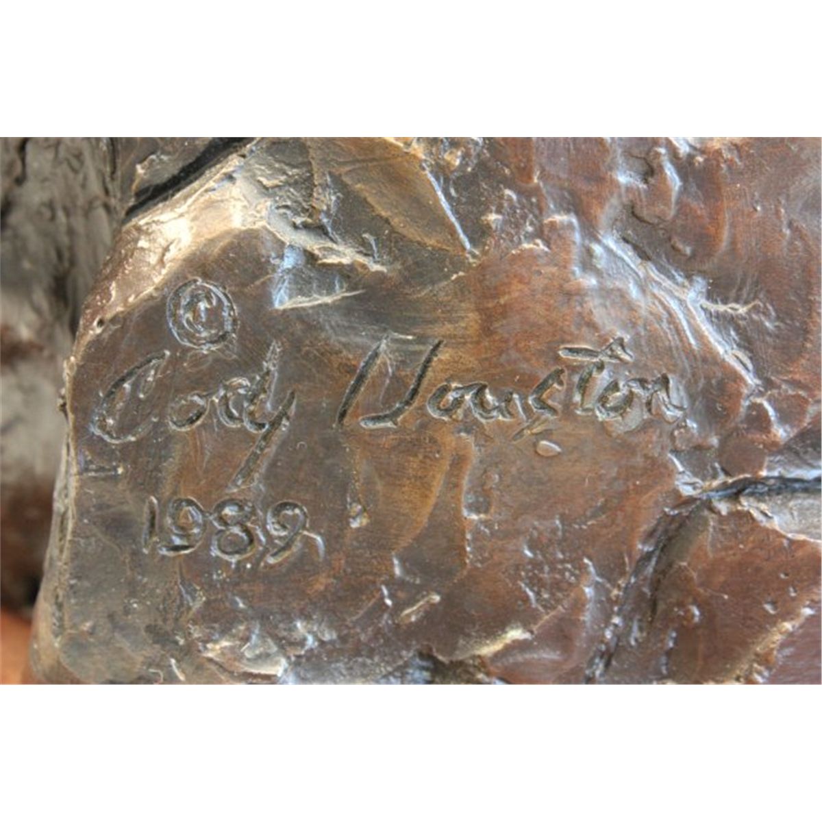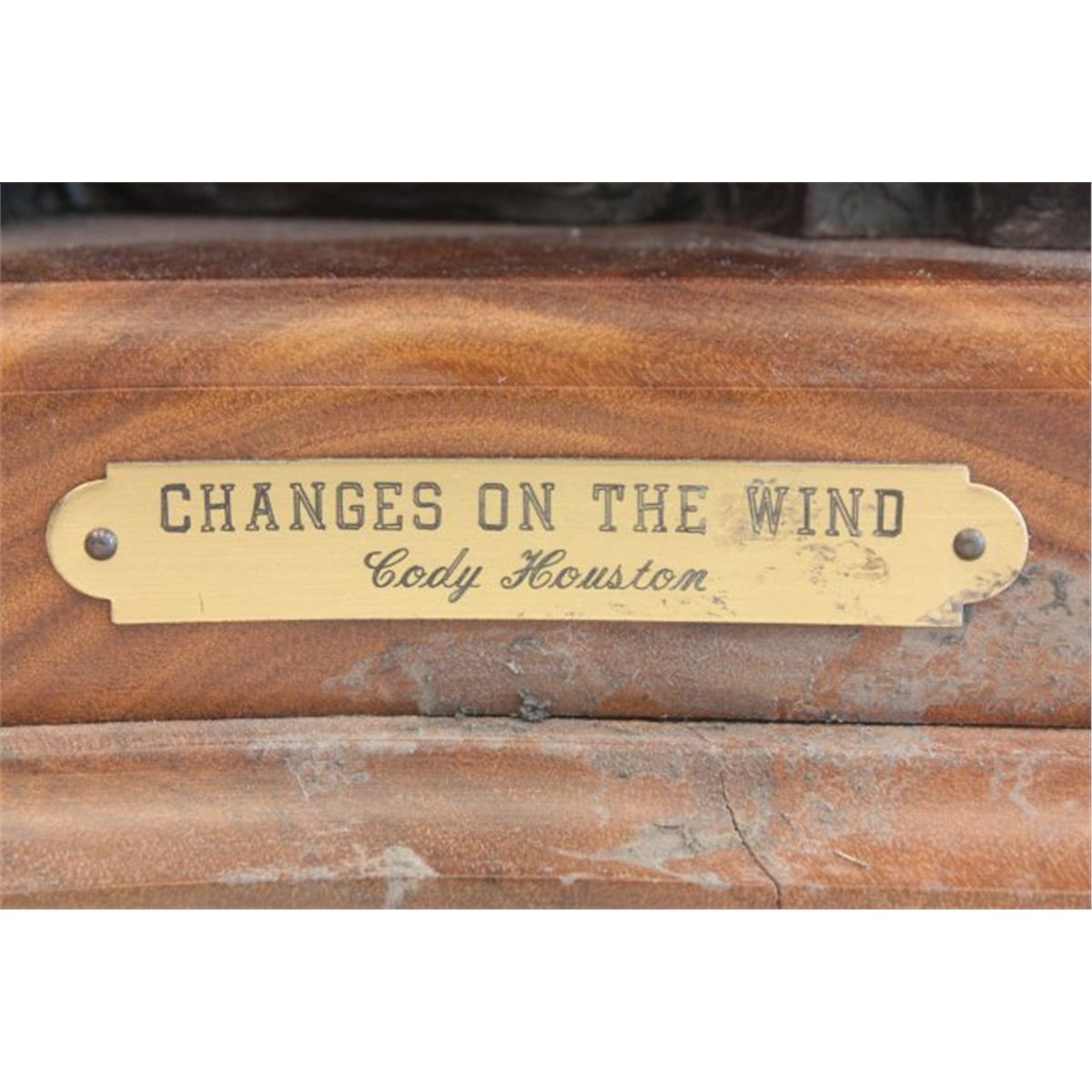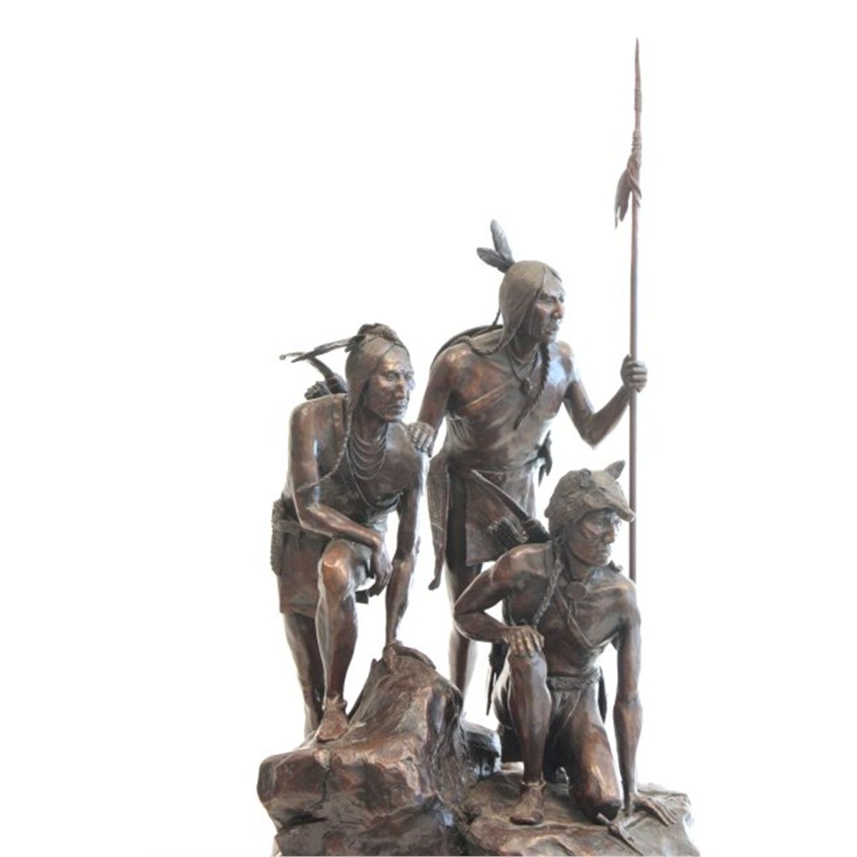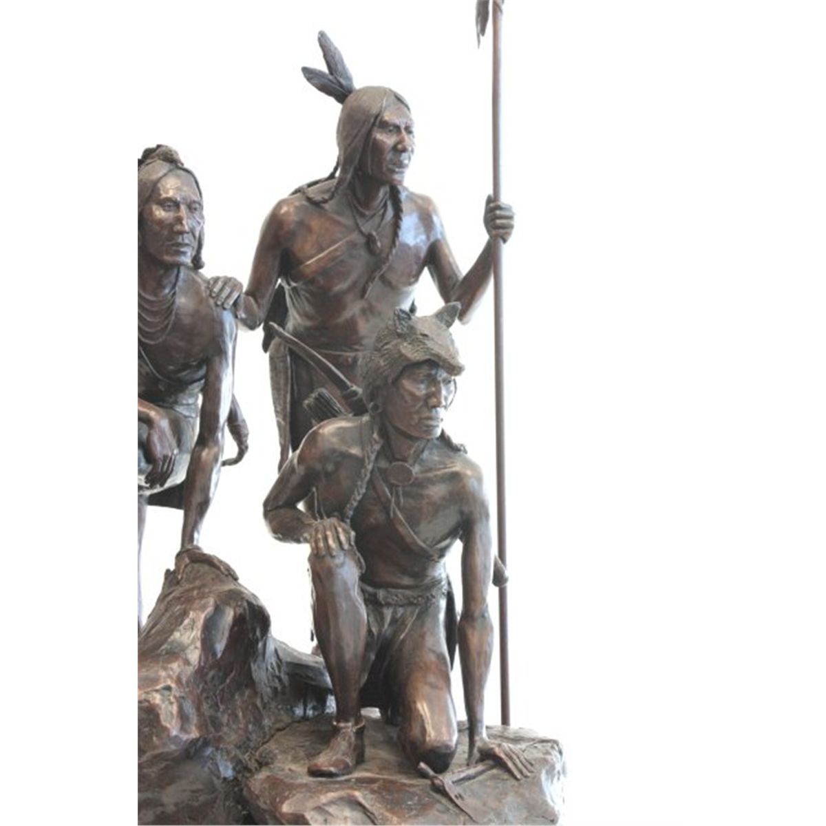 Cody Houston (20thc American) "Changes in the Wind" bronze group of three Native American Braves standing on a rock, 27" high x 12" wide x 16" deep, signed Cody Houston, dated 1989, foundry stamp, on wood base 30" high overall