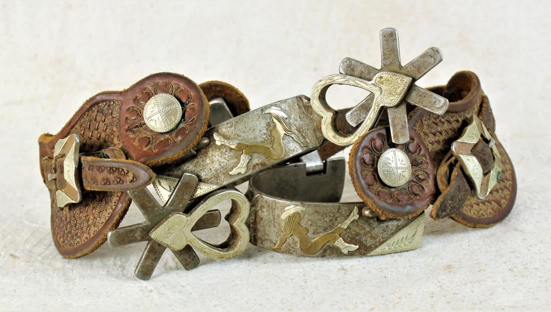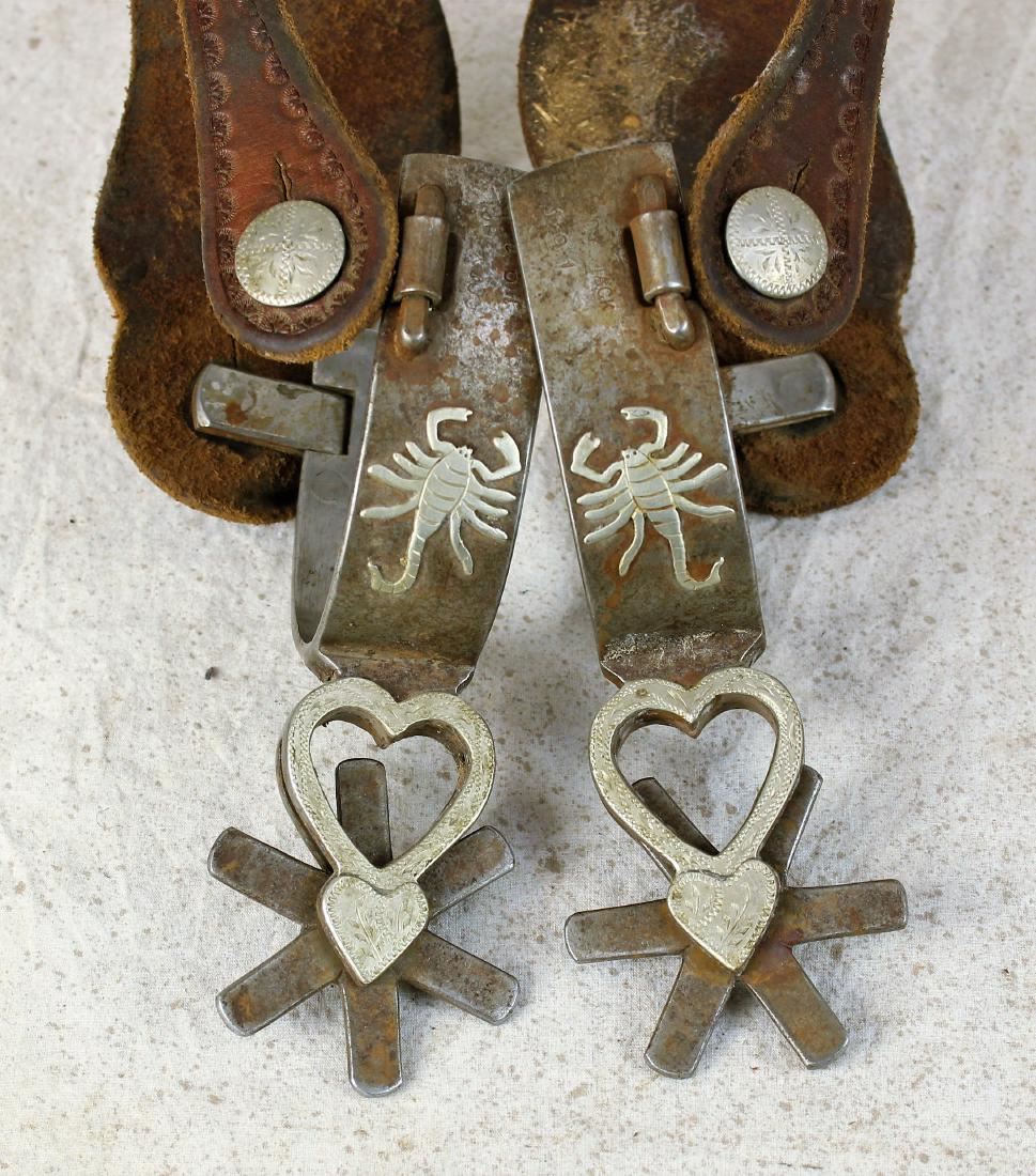 Large iron spurs decorated with cowgirls, scorpions, cut-out hearts and huge rowels, and completed by nice straps.