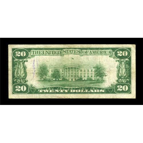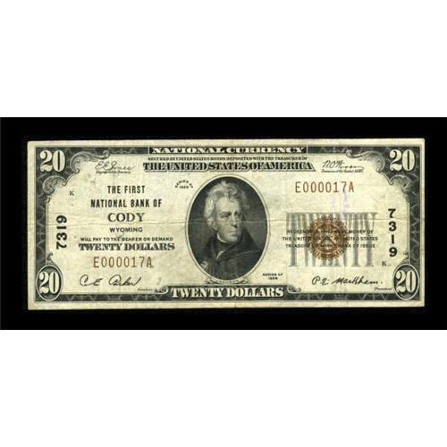 <B>Cody, WY</B></I> - $20 1929 Ty. 1 <B>The First NB</B></I> Ch. # 7319<BR> A very scarce note from a much in demand location, with this piece new to the census, and offered here for the first time at public sale. <B>Fine++,</B></I> with a few pinholes and a touch of ink on the back that is barely worthy of mention. <BR><I>From The Walla Walla Collection</B></I><BR><BR><b>Shipping:</b> Coins & Currency (<a target="_blank" href="http://www.heritageauctions.com/common/shipping.php">view shipping information</a>)