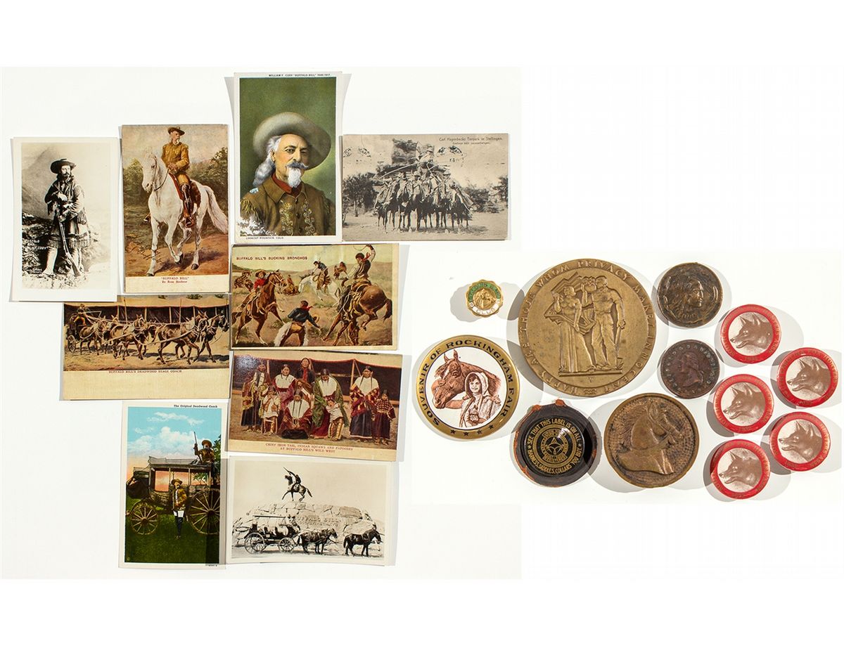 1932 This is a lot that contains RPCs and colorized postcards of American West icon Buffalo Bill Cody and several coins and pins from various and sundry leatherworker and harness makers. Postcards include those of the Deadwood Stage, bucking broncos, Indians and some portraits of the Colonel. Union coins come from Nashville, Kansas City, Mo, and buttons from the 1932 South Caroline Fox Hunters Association. - HKA#65263
