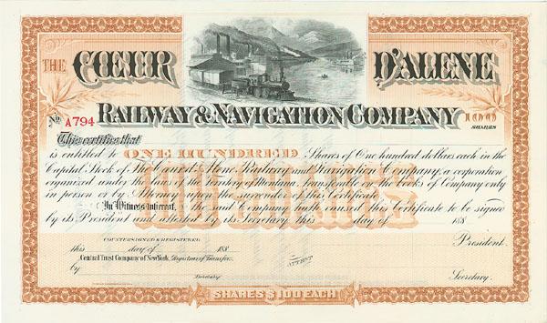 188-. Idaho. Unissued stock certificate. Brown/Black. Beautiful engraved vignette of a train departing a station along a river with a sidewheeler and mountains in the background. Uncancelled and Excellent.