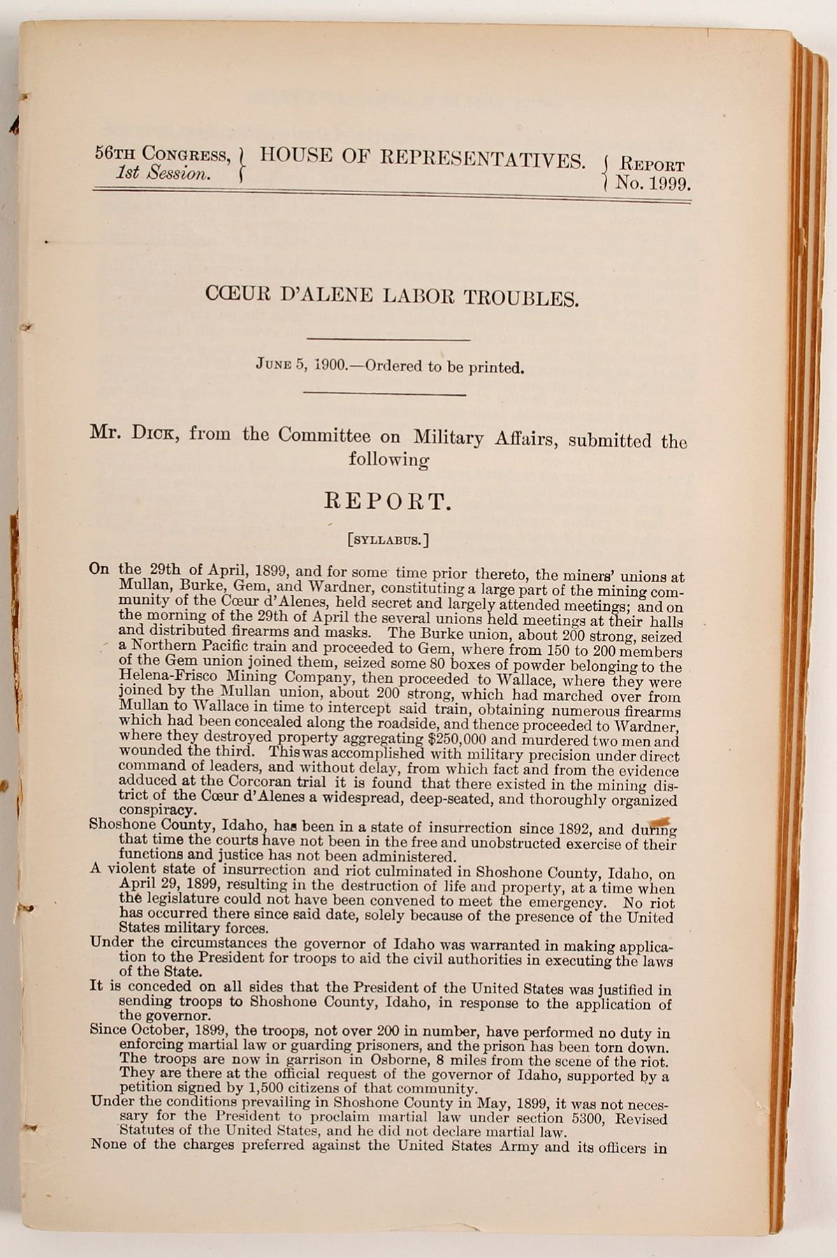 This is a 132-page report, number 1999, prepared for the 56th Congress, First Session, of the US House of Representatives regarding labor troubles that occurred in the mining district around Coeur d'Alene, Idaho in the late 1890s beginning with a labor strike in 1982. The report includes background information on the situation and conditions that lead up the the "insurrection and riot" on April 29, 1899 which resulted in the death of two men, the wounding of a third, and $250,000 in property destruction. The governor of Idaho had appealed to the US President William McKinley for military intervention. Several hundred men were arrested without discretion as to whether they were involved in the miners' union or not! This report is a contemporary description of the events and outcomes of the conflict that includes sworn testimony from government and mining officials, civic leaders, and those incarcerated in the aftermath. It is an interesting perspective on a pivotal event in the mining and labor history of the United States. The book contents are intact and complete in excellent condition, although the covers are missing. State: Idaho City: Coeur d'Alene Date: 1900
