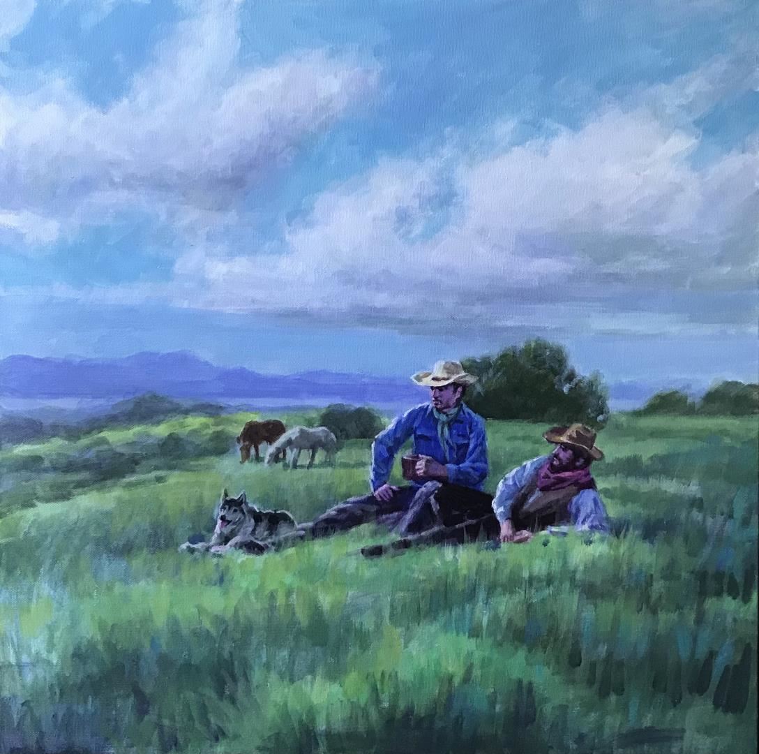 Two cowboys take a coffee break out on the range. An original 24x24" acrylic on stretched canvas by Richard Ho. w/COA.