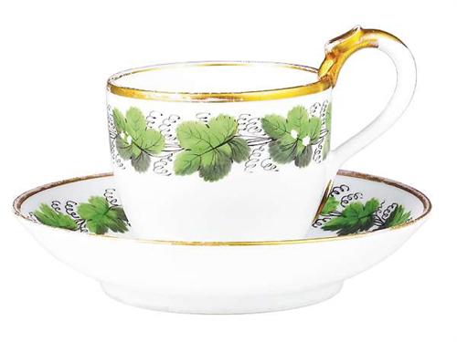 Porcelain, colour painting and gilt, stylised swan handle. Slightly imperfect glaze, the saucer is hair-cracked. Marked: under glaze blue. Schlaggenwald, between 1817 and 1832 Size: 8 cm Diameter: 13.5 cm