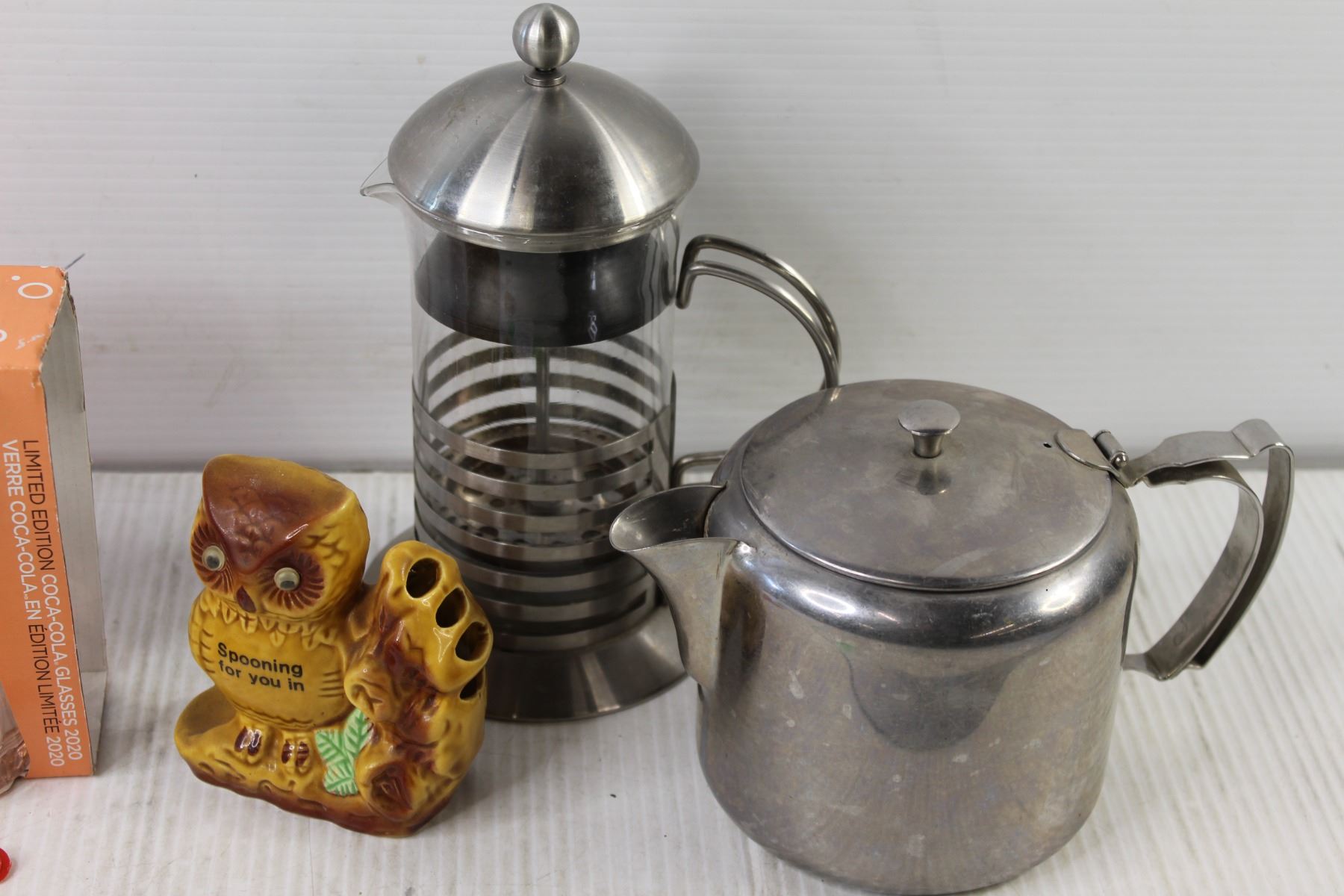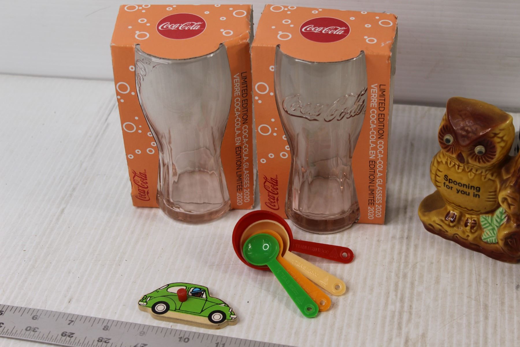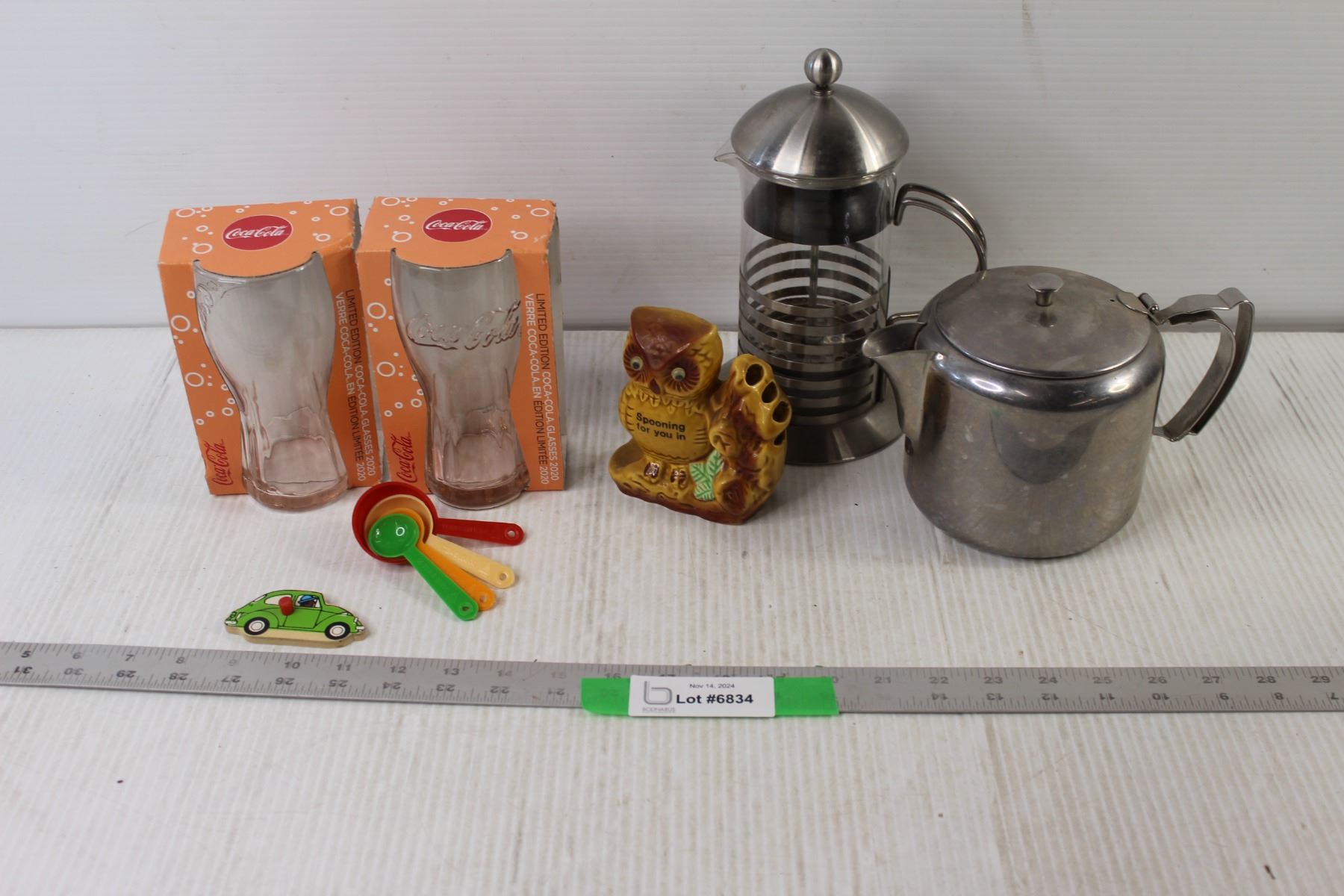 Coffee Percolator, Kettle, Spoon Holders, Measuring Spoons, (2) Coca Cola Glasses
