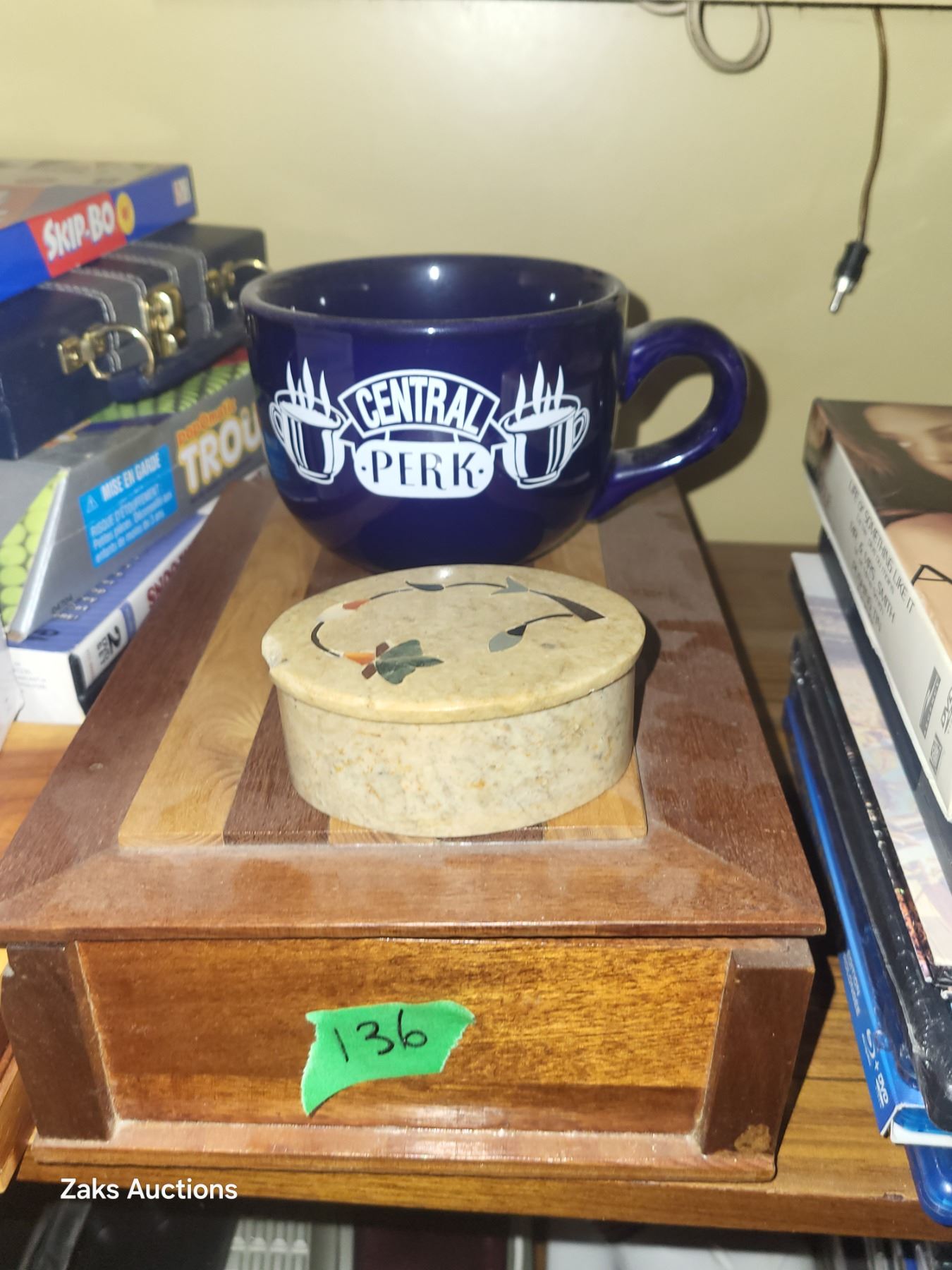 Coffee Perk Mug, Stone Trinket Box, Wooden Box with Contents