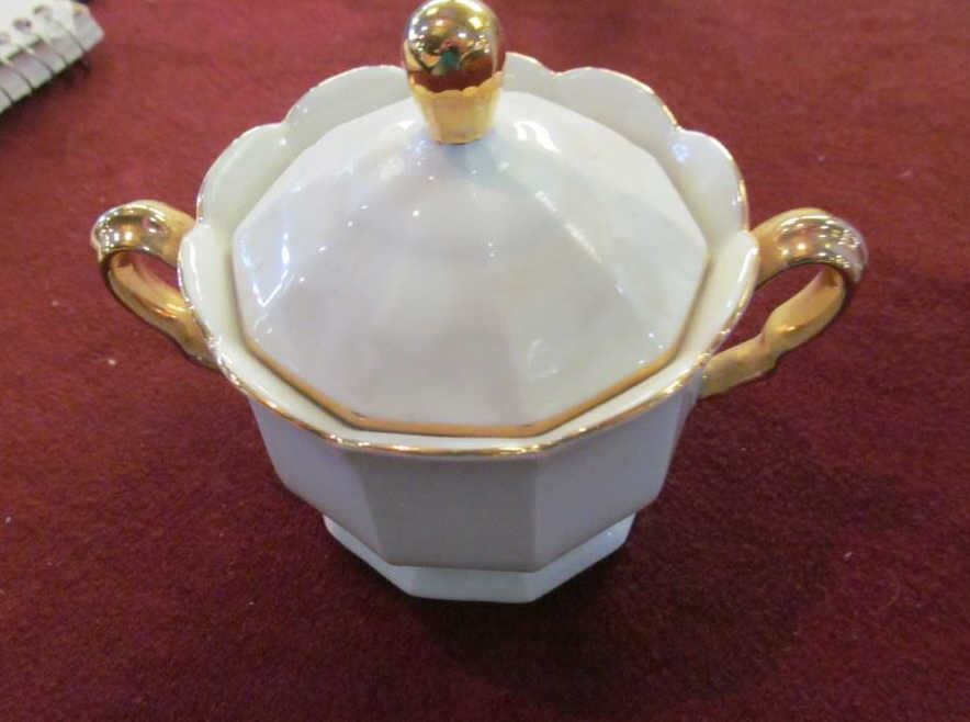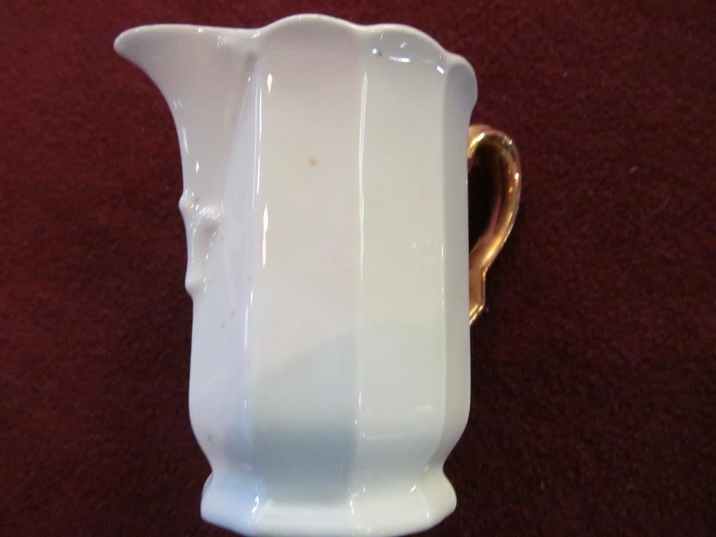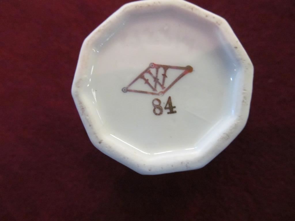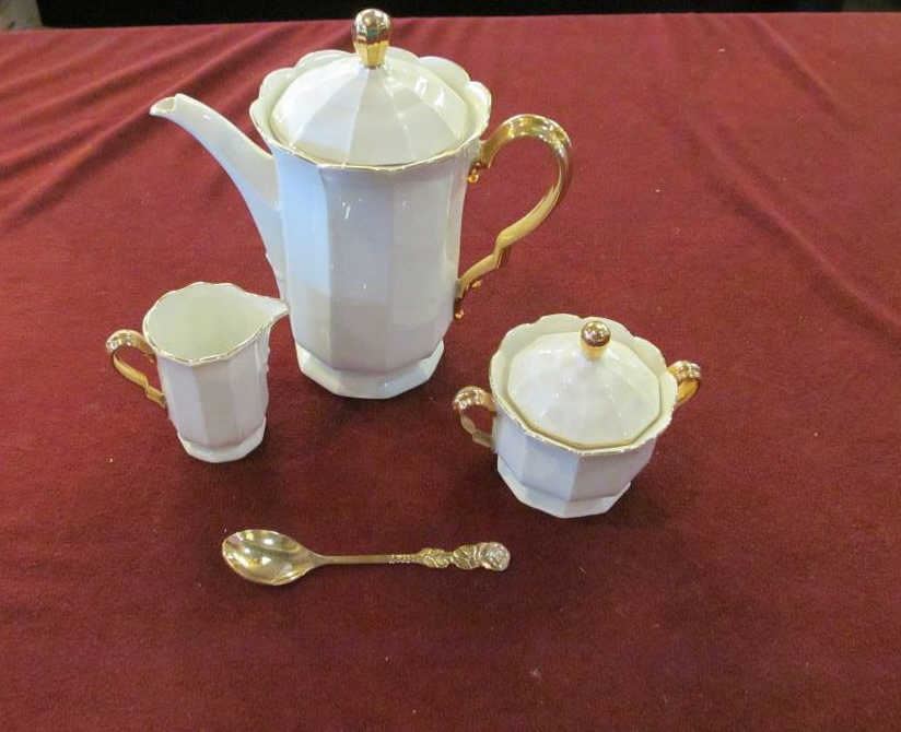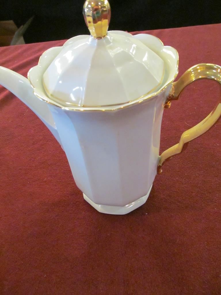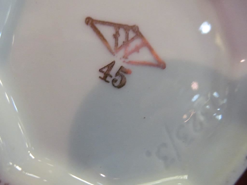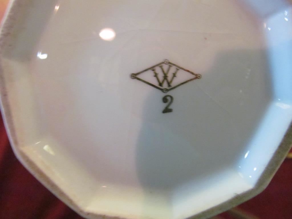white trimmed in gold---marked with a W surrounded by a diamond shape, each piece is numbered