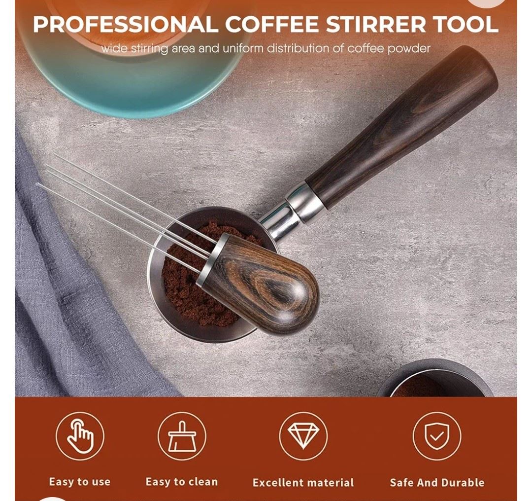 Elegant wood handle, stainless steel whisk, ensures uniform coffee grounds distribution, new.