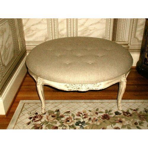 Very large and hard to find,unquie tufted Louis XV round stool with carved aged antique white scalloped apron. Oyster shell and acanthus leaf carving with swag on all 4 sides of the apron. More leaf carving on the knees of the short cabriole legs and feet. Upholstered in the finest of taupe/camel linen,double welted around the sides and covered button trim on the top. The large top andd 18 inch height makes this piece perfect for a coffee table with large tray. Wonderful height for a foot stool or ottoman as well. The painted frame has bits and pieces of the wood showing through from age and wear,adding wonderful character. Springs and underpinnings very tight. Upholstery,excellent. Measures 40L X 40W X 18.