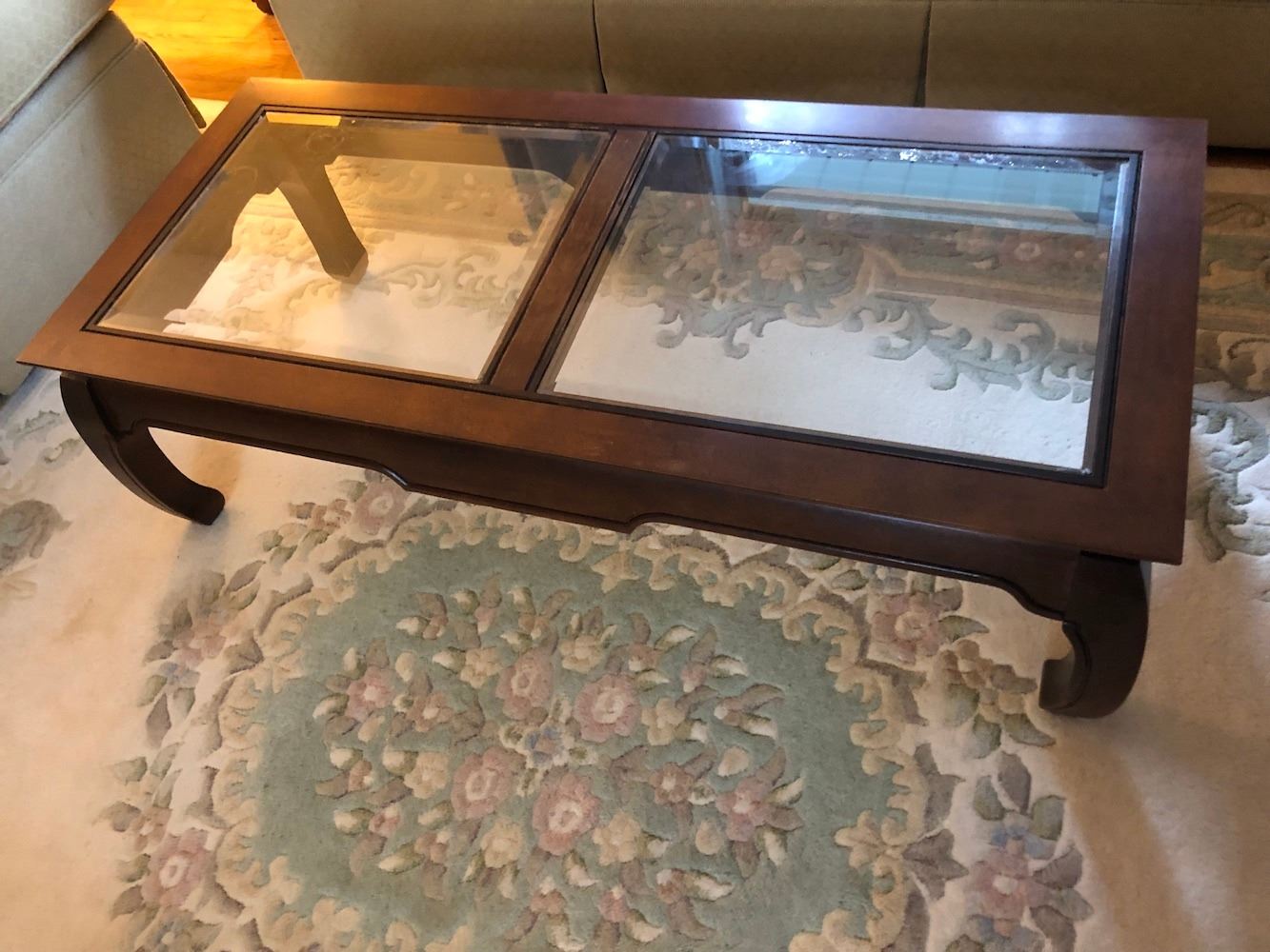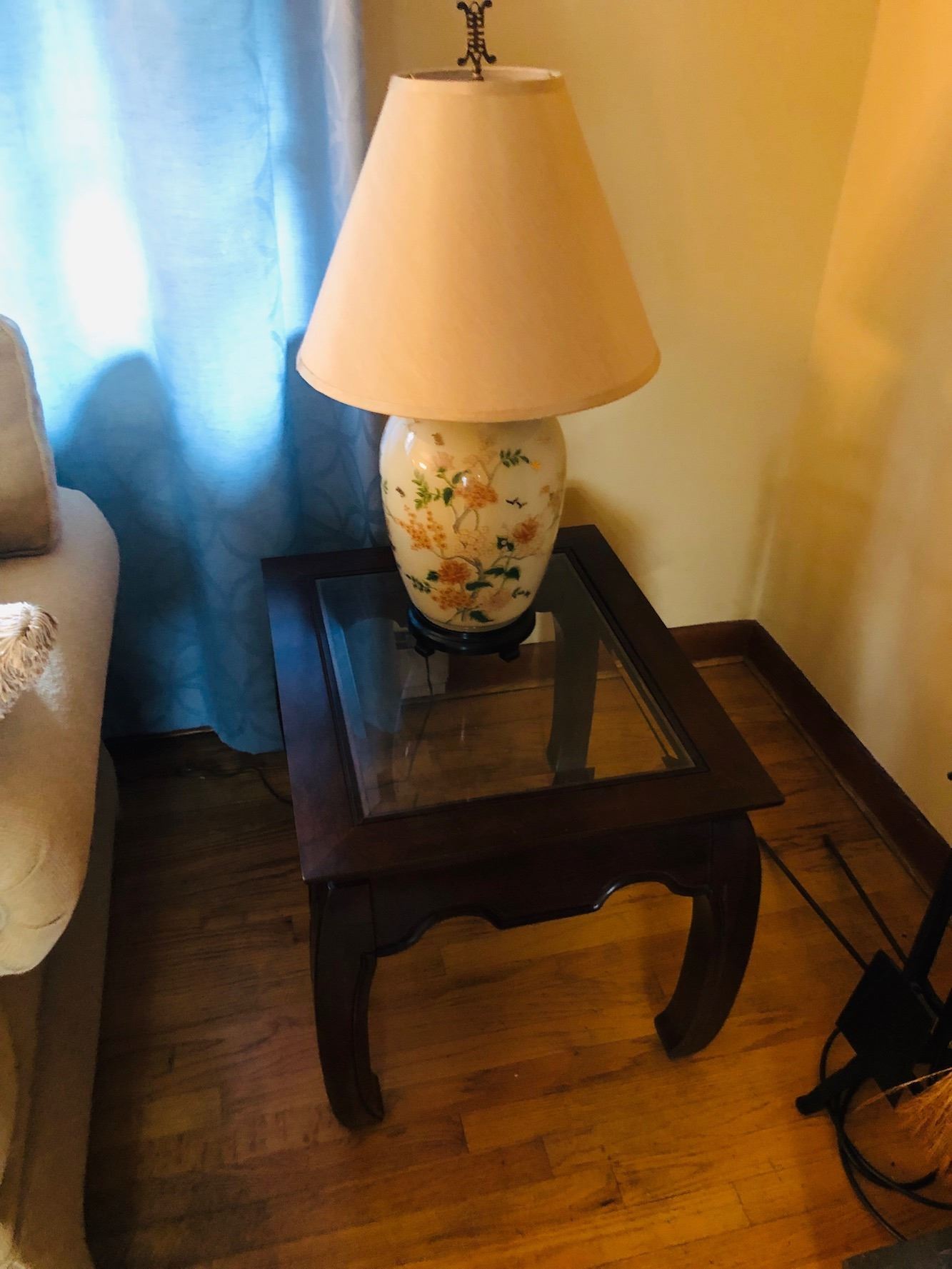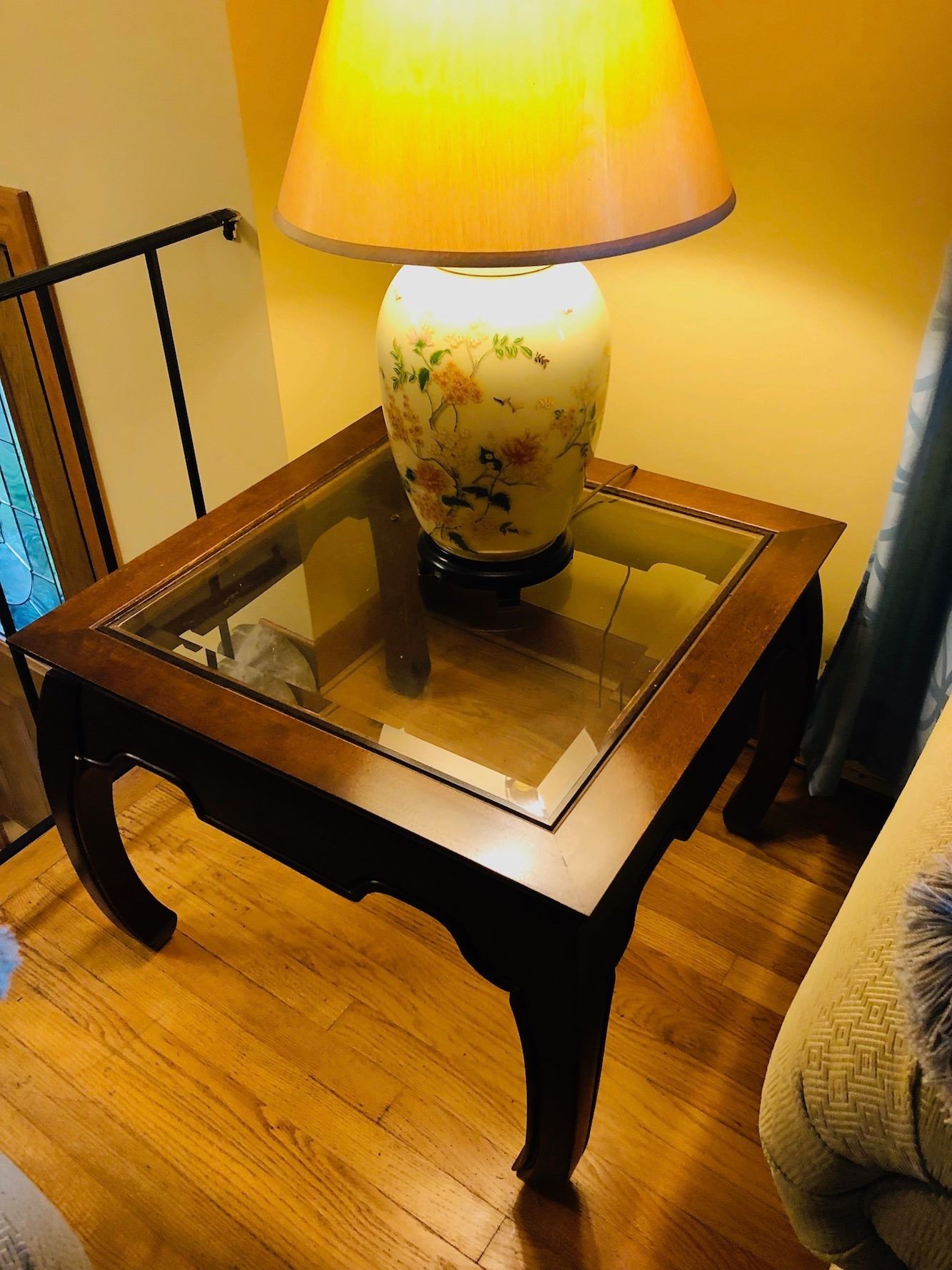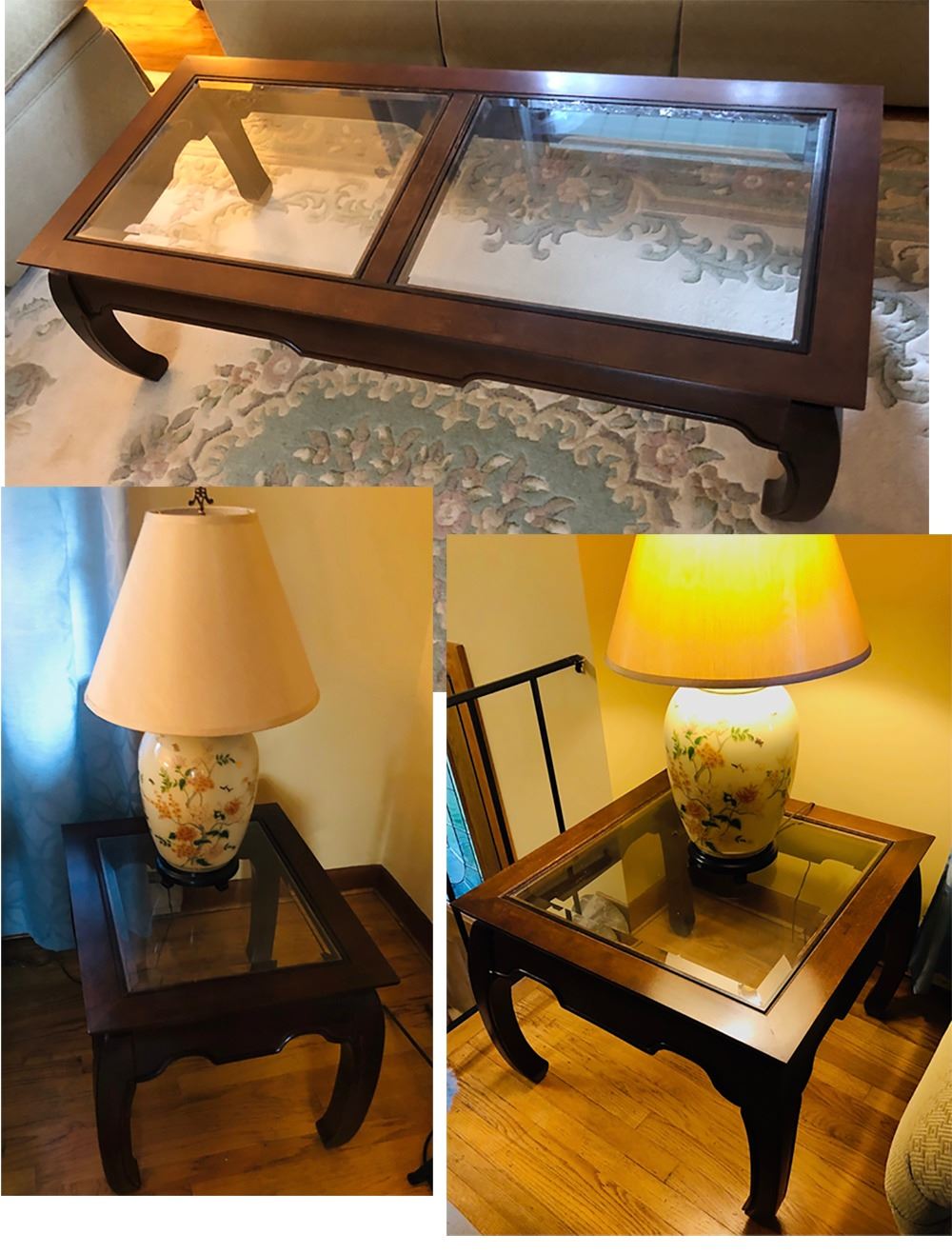Matching wood and glass top coffee table and end tables, 2 matching table lamps.