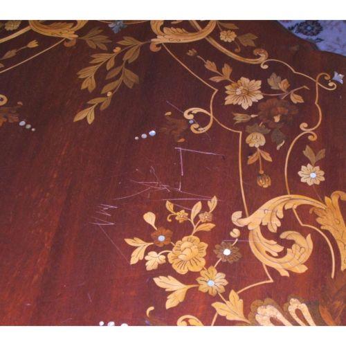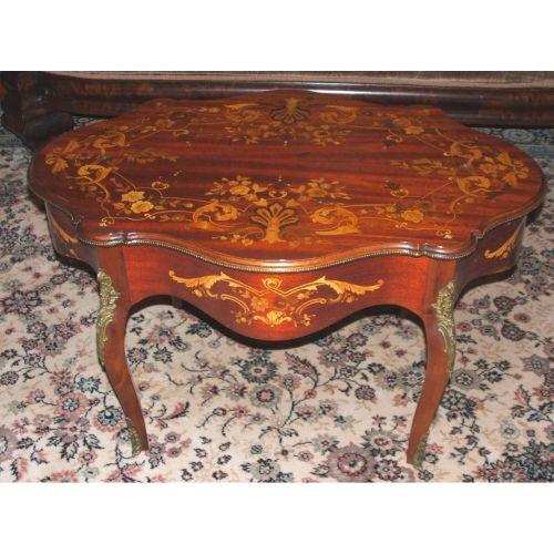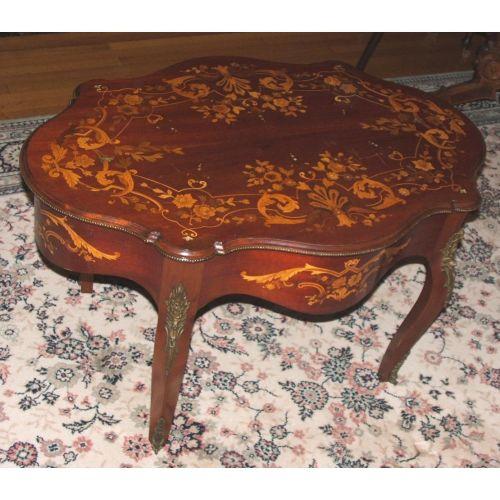Late 19th century. Mixed woods, inland. Cabriole legs with ormolu trim below a shaped top with floral scroll inlay and a conforming inlaid skirt. 21" high X 30" long.Possible R.J. Hofman.