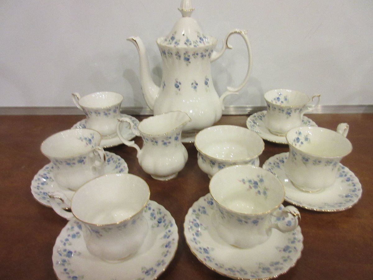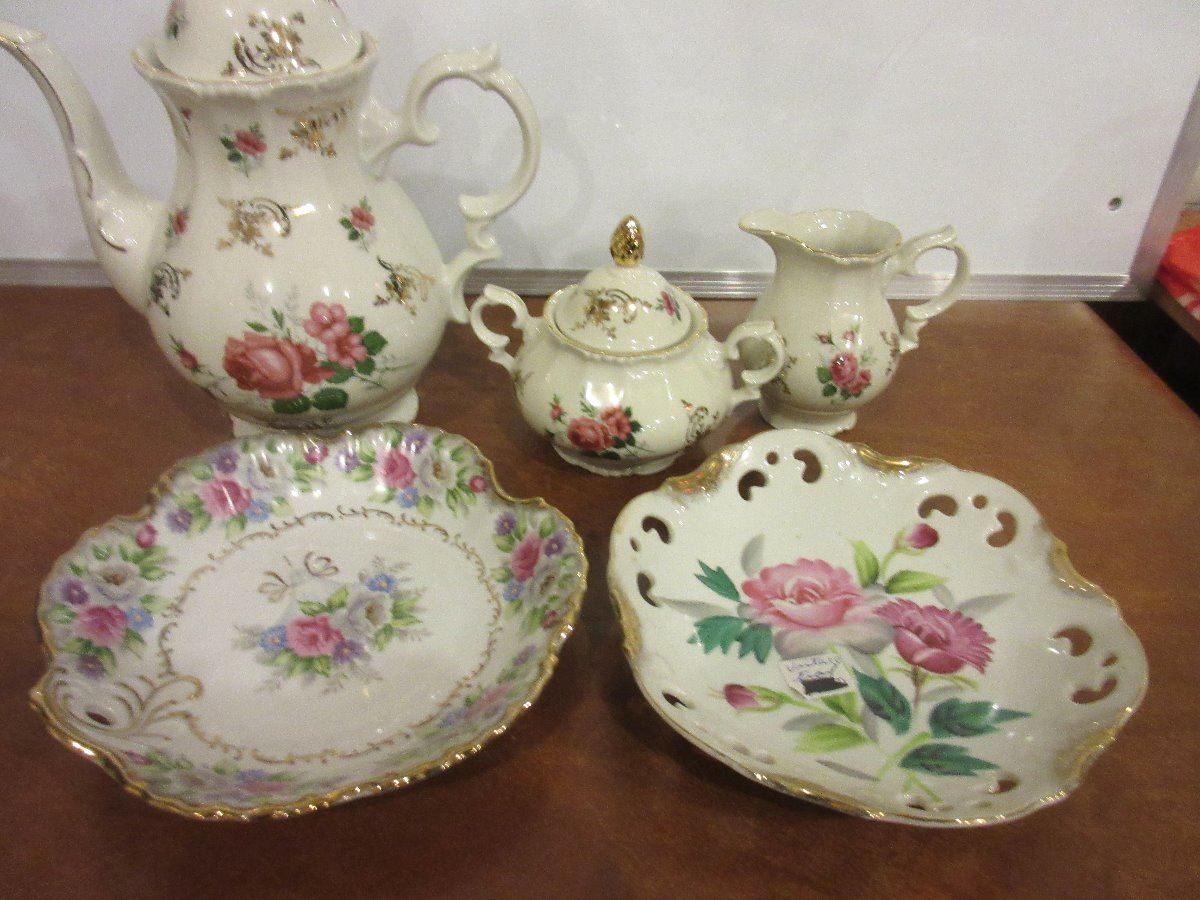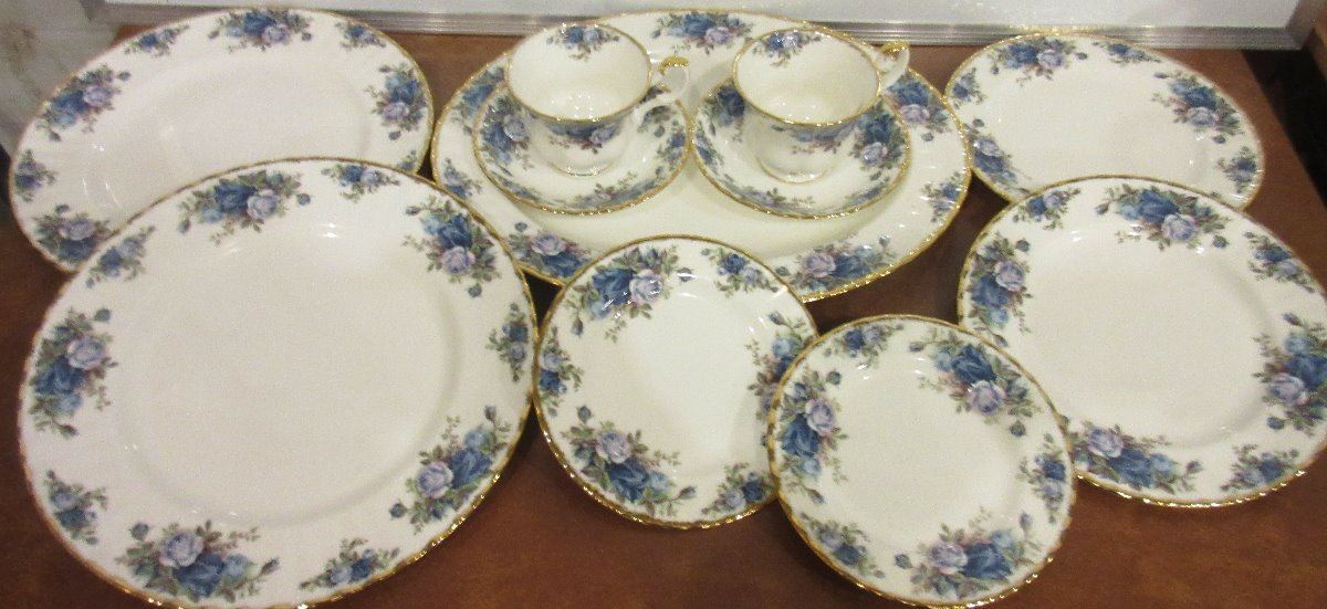 Garets Set of Coffee Service Set with Pot, Royal Albert Memory Lane Creamer Sugar and 6 cups and saucers, 11 pieces of Royal Albert Moonlight Rose dinnerware, 2 dinner plates, 1 serving platter, 2 salad plates,2 bread & butter plates, 2 cups, 2 saucers; Flowered Coffee server with cream and sugar; 2 decorative serving plates one is Bouquet by Stafford 3178