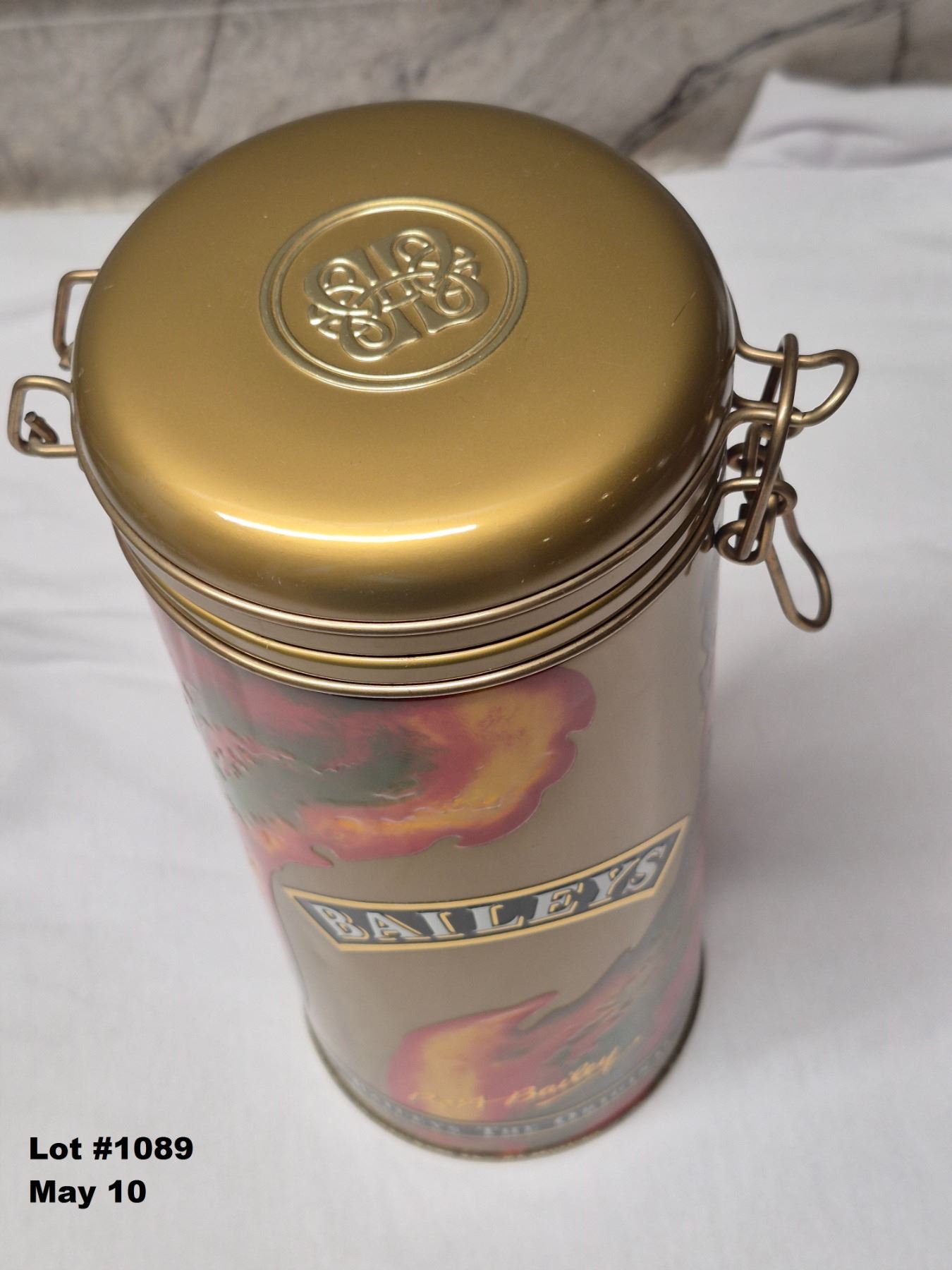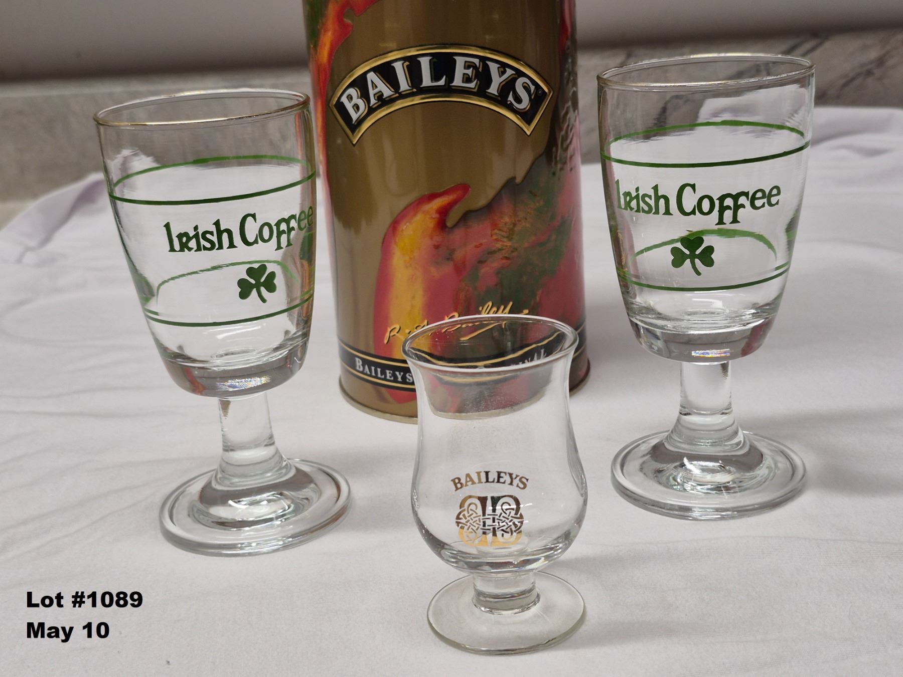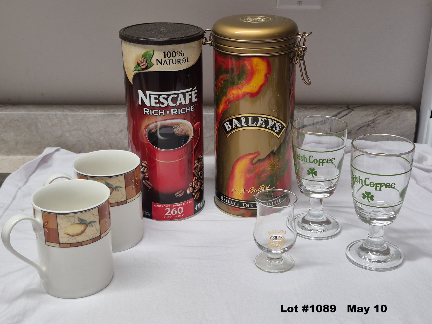 Coffee and Baileys Lot. Baileys 1995 Collector Tin. Irish Coffee Glassware with Gold Rim. Nescafe Coffee Tin and 2 mugs