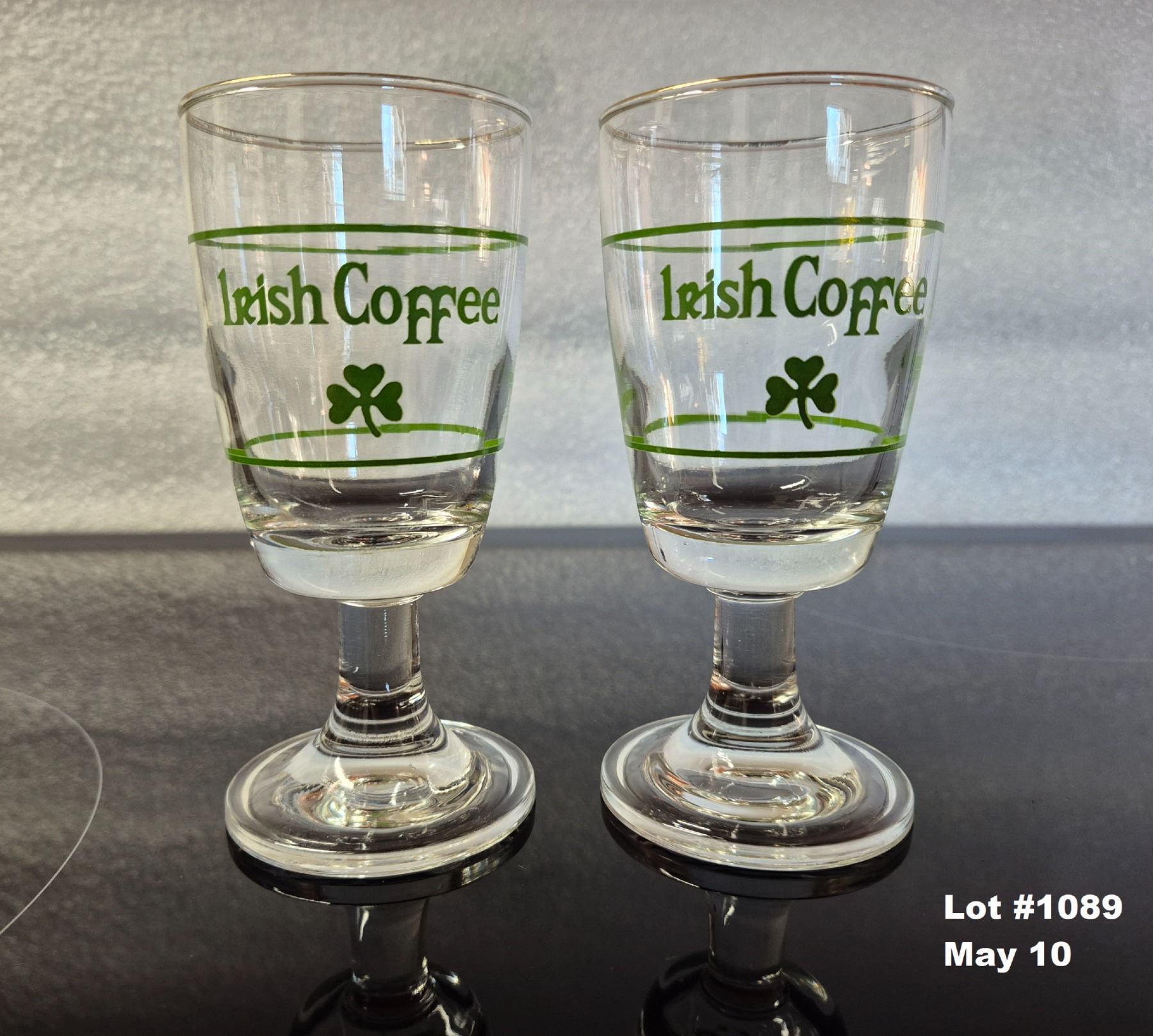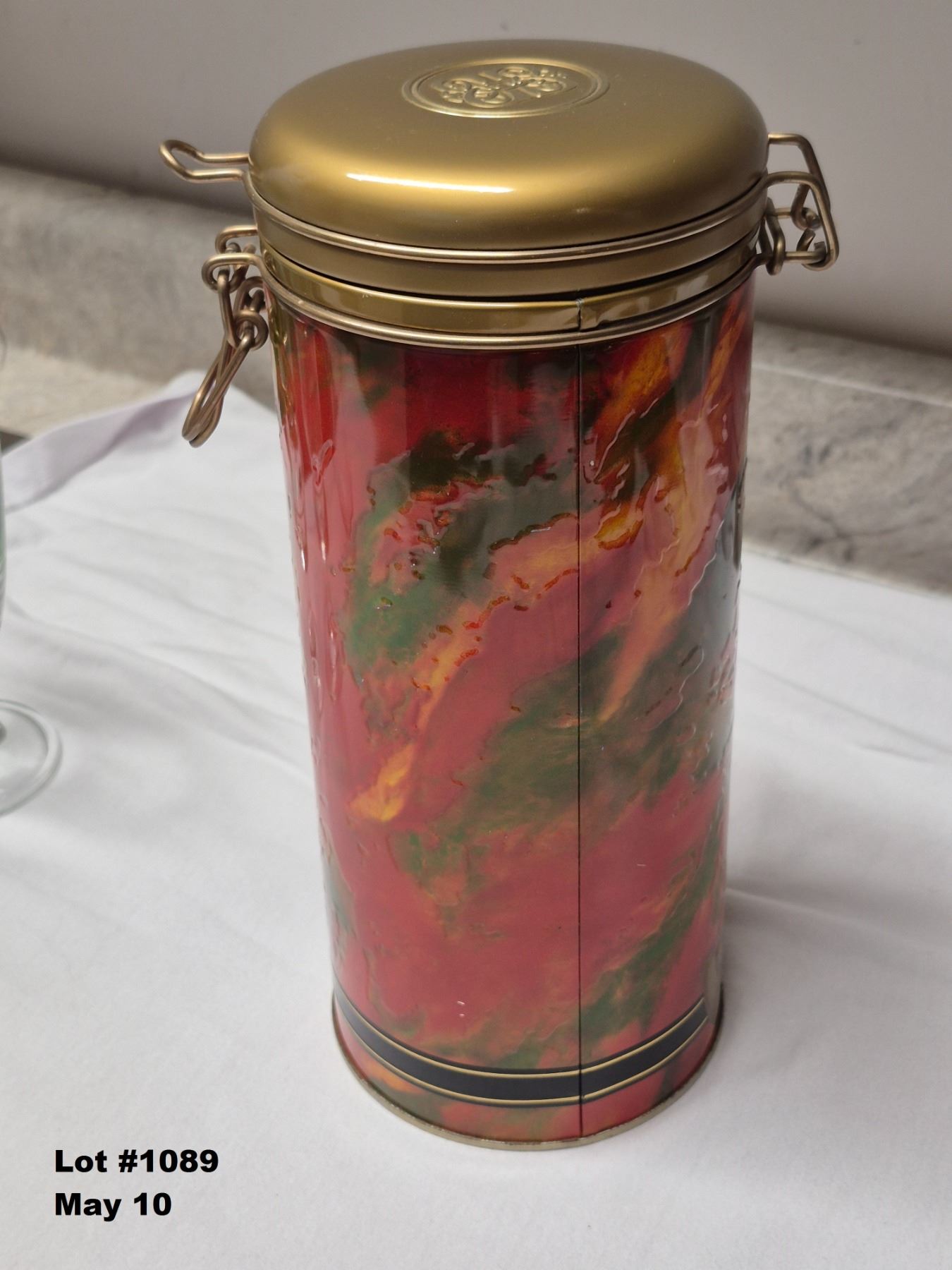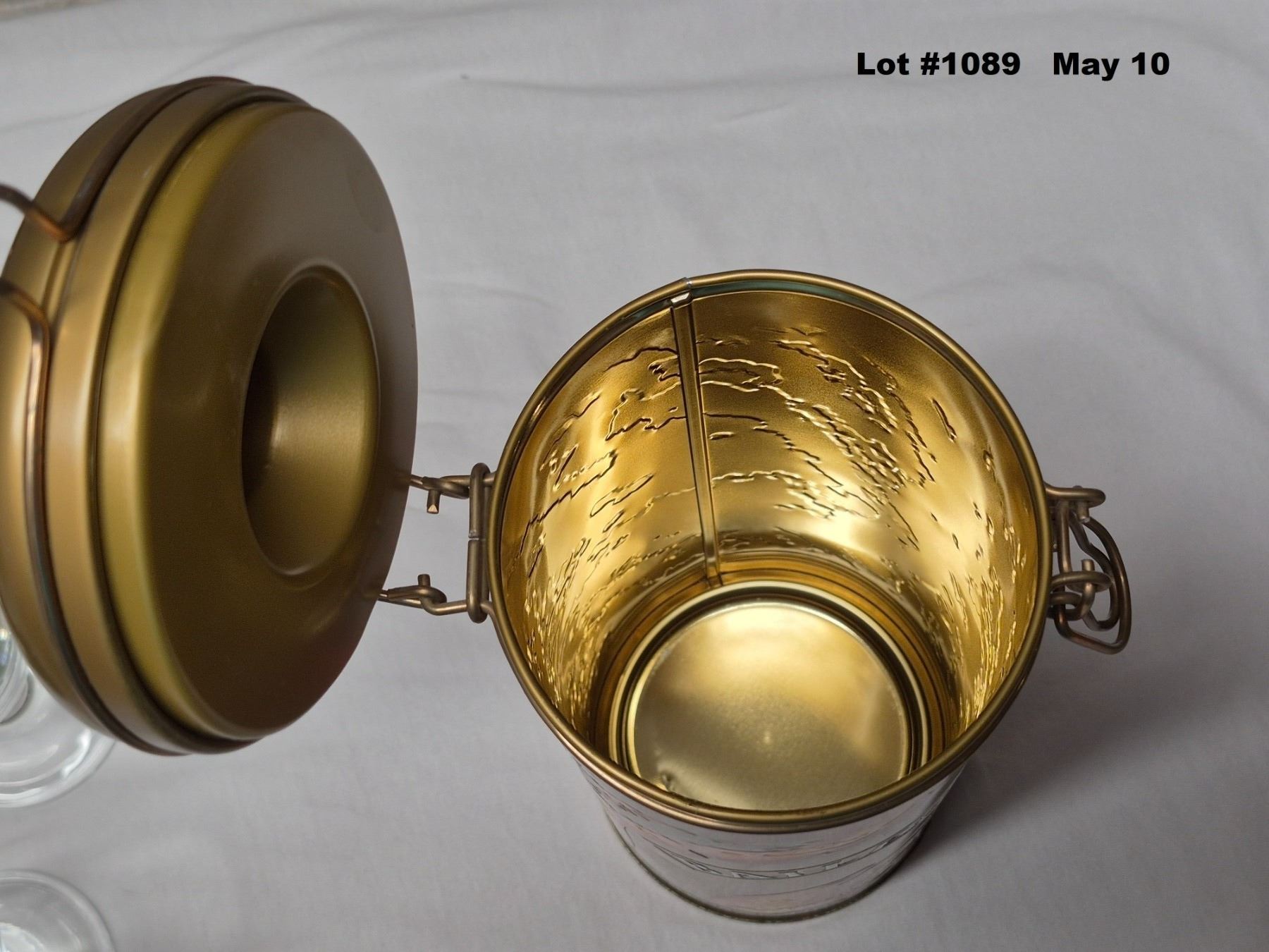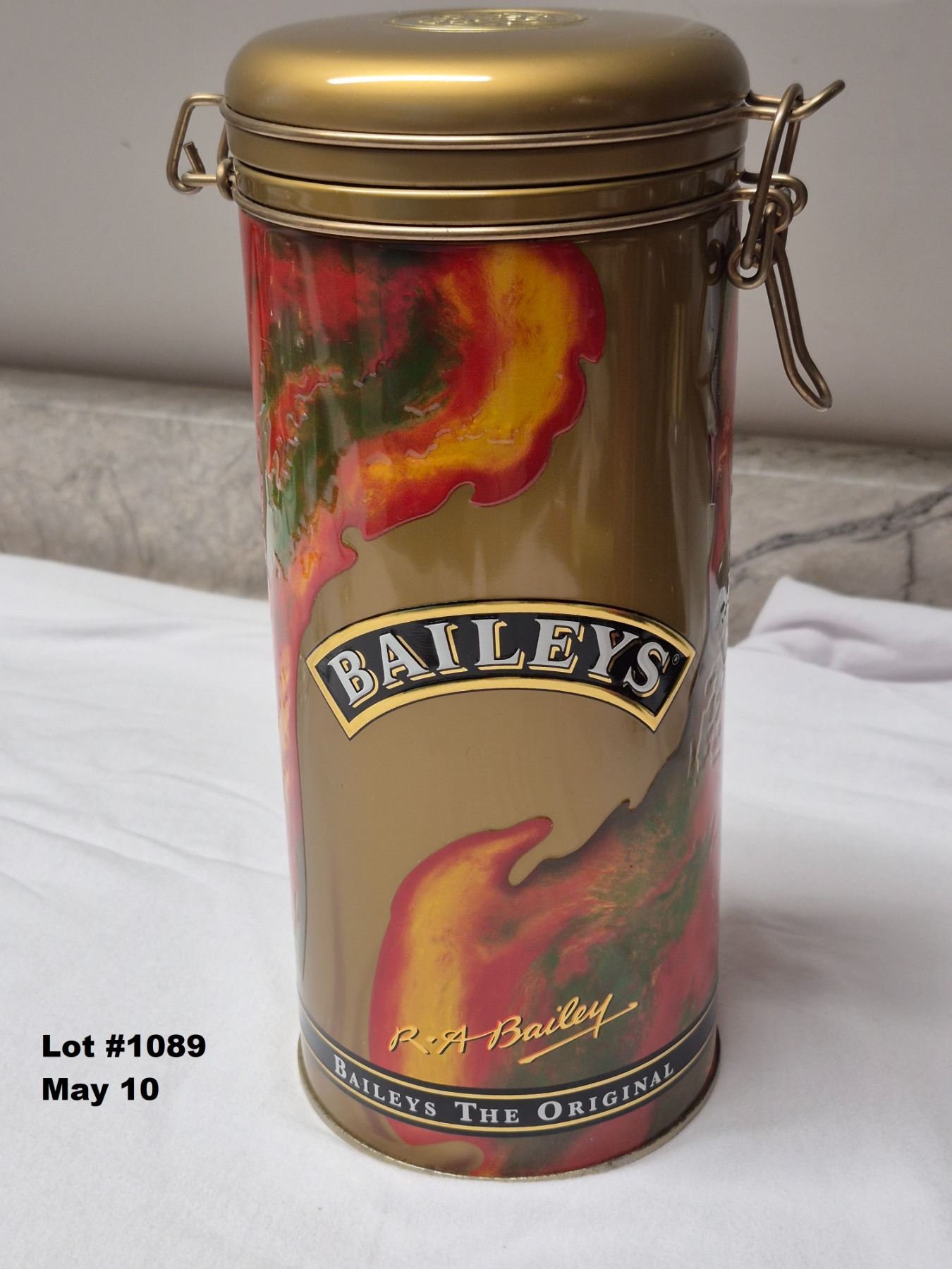 Coffee and Baileys Lot. Baileys 1995 Collector Tin. Irish Coffee Glassware with Gold Rim. Nescafe Coffee Tin and 2 mugs