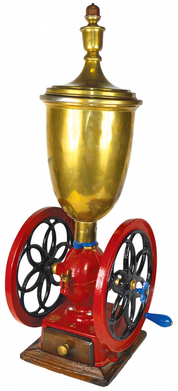 Coffee grinder, Elturia #6, cast iron counter style w/large brass hopper, wood drwr, restored paint, Exc cond, 34"H x 12.5"Dia wheels.