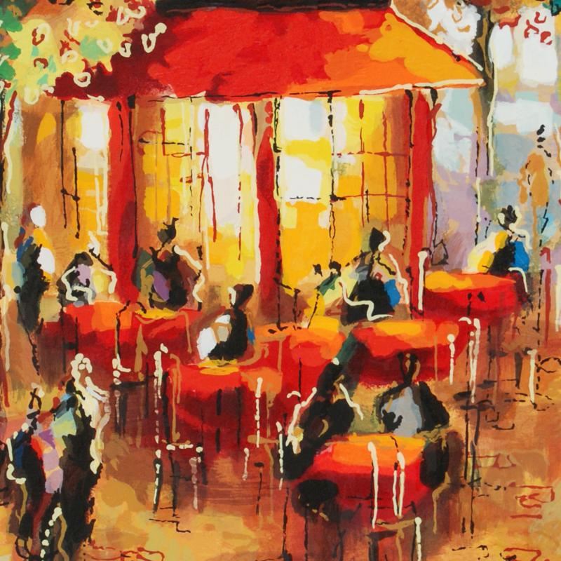 Michael Rozenvain's remarkable art piece is full of rich color and entertaining artistry! "Coffee in Paris" is a limited edition serigraph on paper, hand signed by Rozenvain! Includes Certificate of Authenticity! Measures approx. 16" x 13.5" (with border), 14.5" x 12" (image).