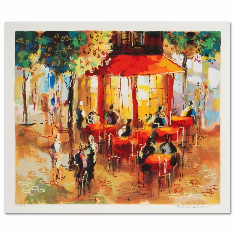 Michael Rozenvain's remarkable art piece is full of rich color and entertaining artistry! "Coffee in Paris" is a limited edition serigraph on paper, hand signed by Rozenvain! Includes Certificate of Authenticity! Measures approx. 16" x 13.5" (with border), 14.5" x 12" (image).