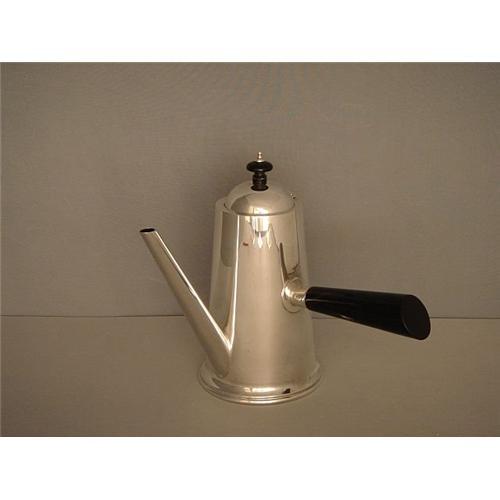 This Coffee or Cocoa pot has a super Art-deco design!The quality is also superb! It has a fabulous bakelite handle which also reiterates the form of the spout and pot. It is sterling silver and I am sure from the design and quality it is from the 1920s. Unfortunately the hallmark is unknown to me. It is very difficult to define.It stands 8ins - 20cm high including finial, and from the tip of the handle to the outside of the bottom base 8.5ins - 21.5cm. From from the tip of the spout to the outside bottom base 6.5ins - 16.25cm. It is a good size , it holds 5 normal teacups!A great pot that would fit in with any table decor, and when used would cause alot of admiration!
