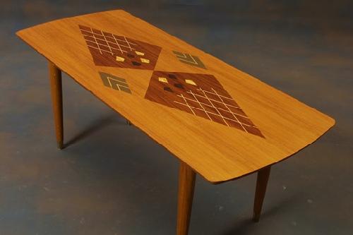 Coffee table, mahogany with intarsia in different kind of wood . Möbelbolaget Tranås, 1950-tal, H 58, 54x130.