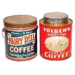 Coffee tins (2); Fairy Dell Coffee 4# pail, Peoria, Ill., VG condition & Folger's Golden Gate Coffee 5# canister, Kansas City-San Francisco, Good+ condition, both w/replacement lids, 8" & 9"H.