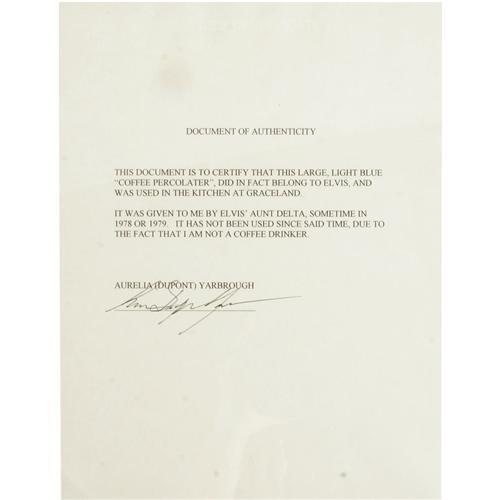 <B>Coffeemaker From Graceland Kitchen.</B></I> A General Electric immersible coffeemaker, blue with white floral design and detachable electrical cord, used in the main kitchen of Graceland. In Fine to Very Fine condition with mild to moderate wear from regular use. <I>From the Aurelia Dupont Collection</B></I>.<BR><BR><b>Shipping:</b> Miscellaneous Collectibles, Smal (<a target="_blank" href="http://www.heritageauctions.com/common/shipping.php">view shipping information</a>)