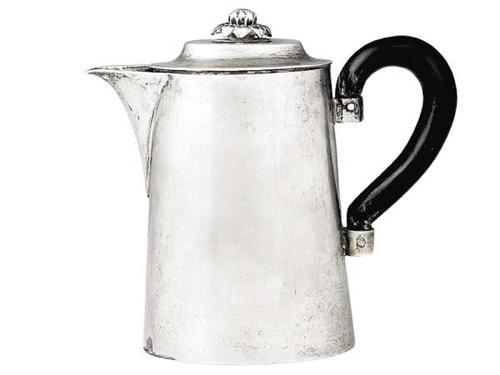 Silver, 269 g. Oval form, hinged cover with floral decoration. Restored by soldering, the wooden handle is replacement. Marked: Vienna, 1804. Josef Heinisch Neuwirth: P. 2622, 2623. Size: 13 cm