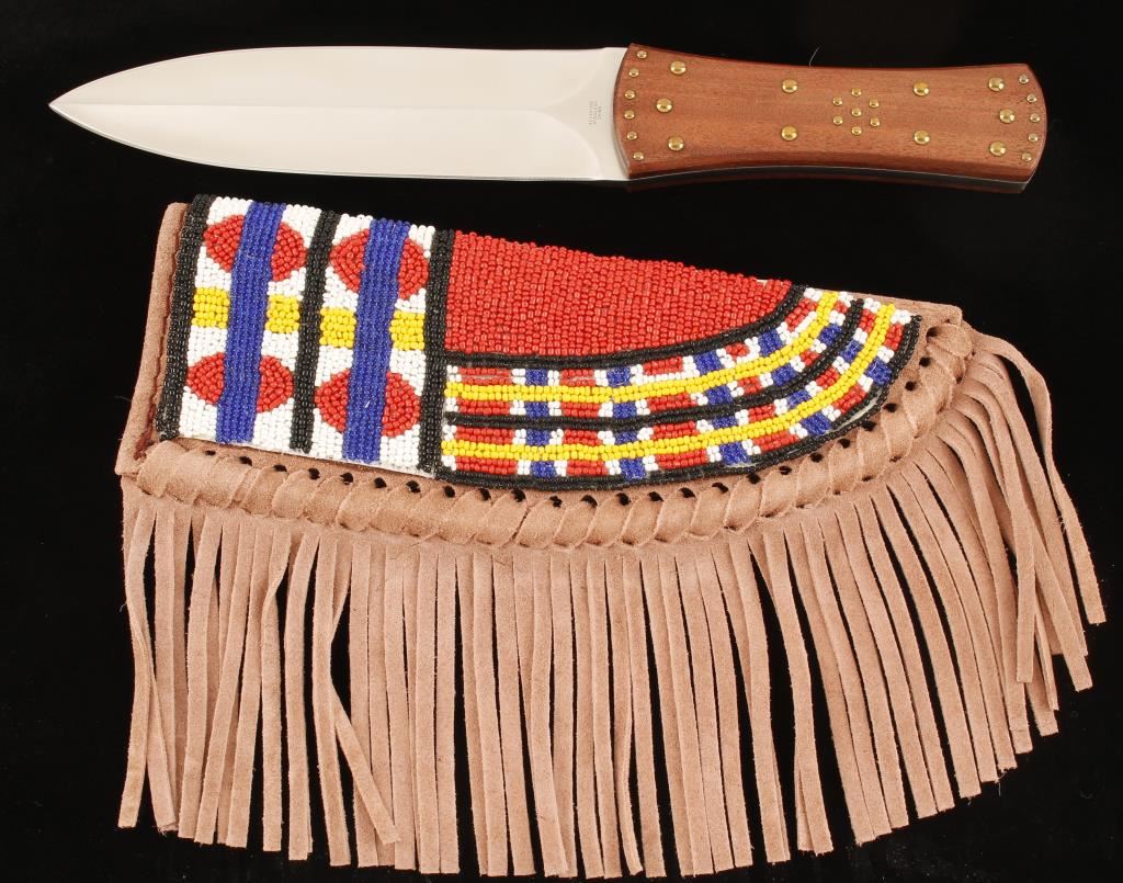 Stainless steel blade with wooden handle with brass tacks. Includes a fully beaded fringed knife sheath.