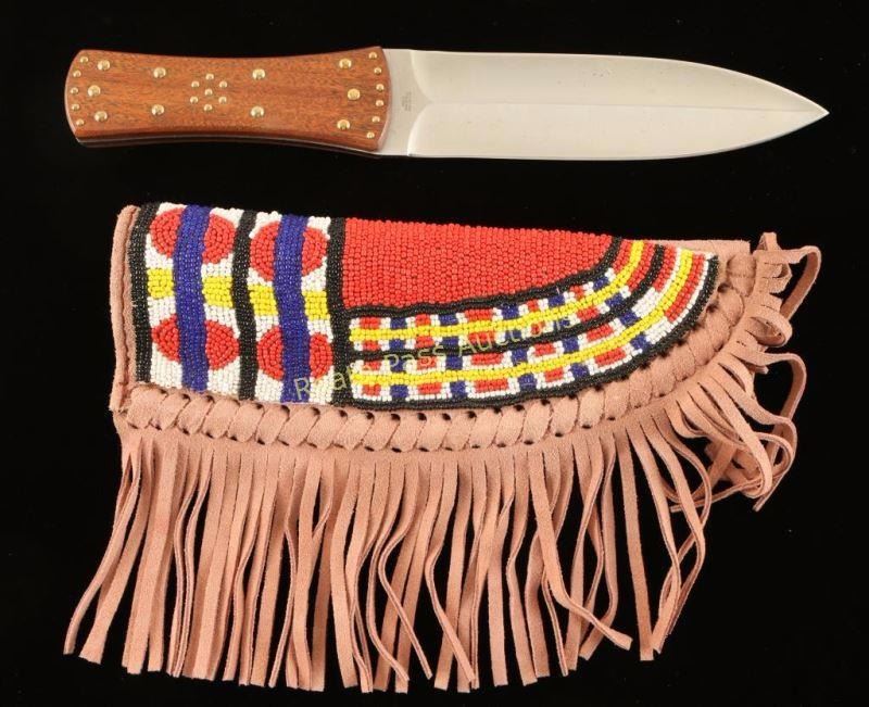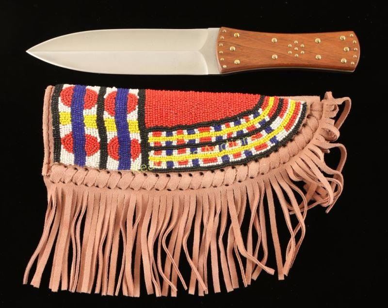 Stainless steel blade with wooden handle with brass tacks. Includes a fully beaded fringed knife sheath.