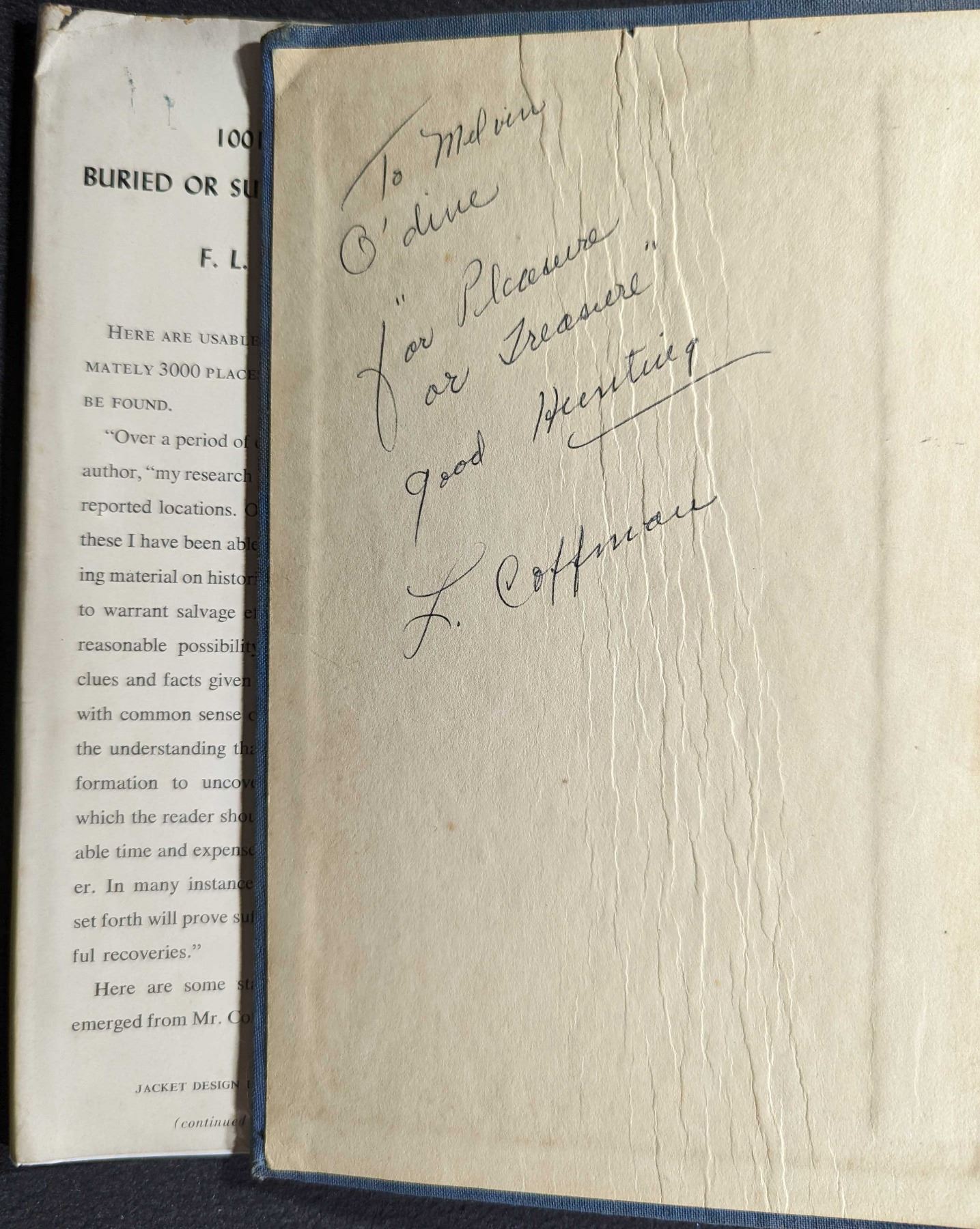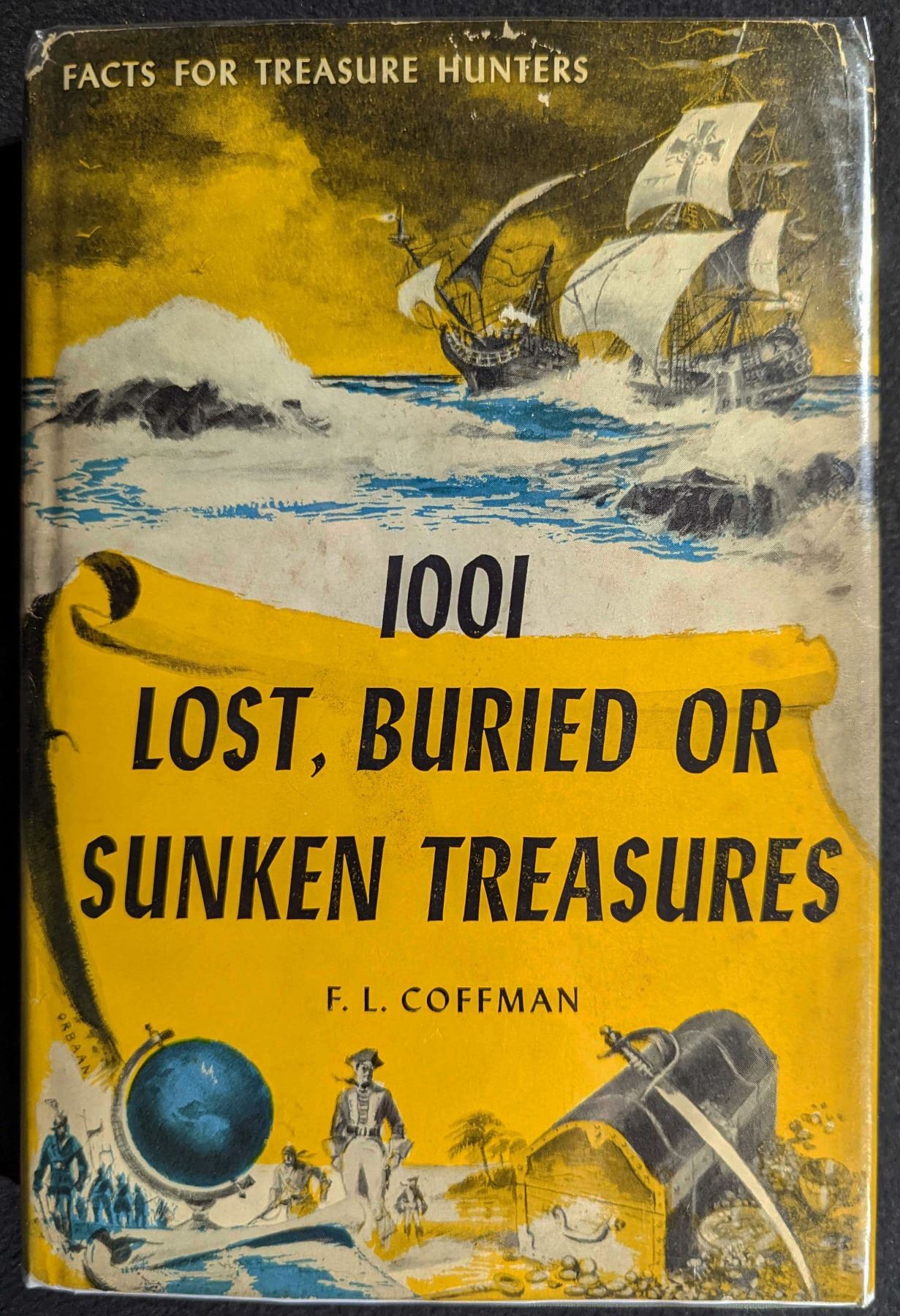 Coffman, F.L. 1001 LOST, BURIED OR SUNKEN TREASURES. FACTS FOR TREASURE HUNTERS. Thomas Nelson & Sons. 1957. 12mo. x, 277, (3) pages. New York. first edition. original blue cloth, lettered in silver; protected chipped dust jacket. some internal highlighting. illustrations. tables. Very Good. inscribed by the author. This book covers a variety of treasures, including wrecks in the Caribbean, wrecks in Florida, Harry Rieseberg and his exploits, Great Lakes wrecks, and treasure hunts in Gorda Cay, Carysfort Reef and Jupiter Inlet. At the end of the book there is a listing of Western Hemisphere treasure wrecks and their estimated value (in 1957). Extremely scarce with signature. Lot weight: 1 lbs 1oz. Subject(s): Buried, Sunken Treasure.