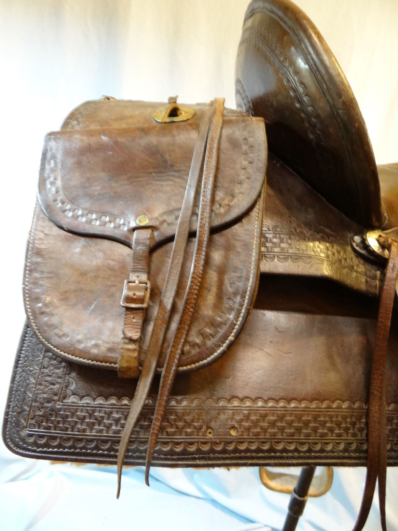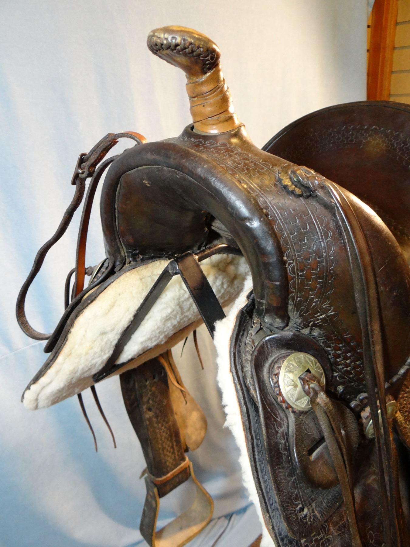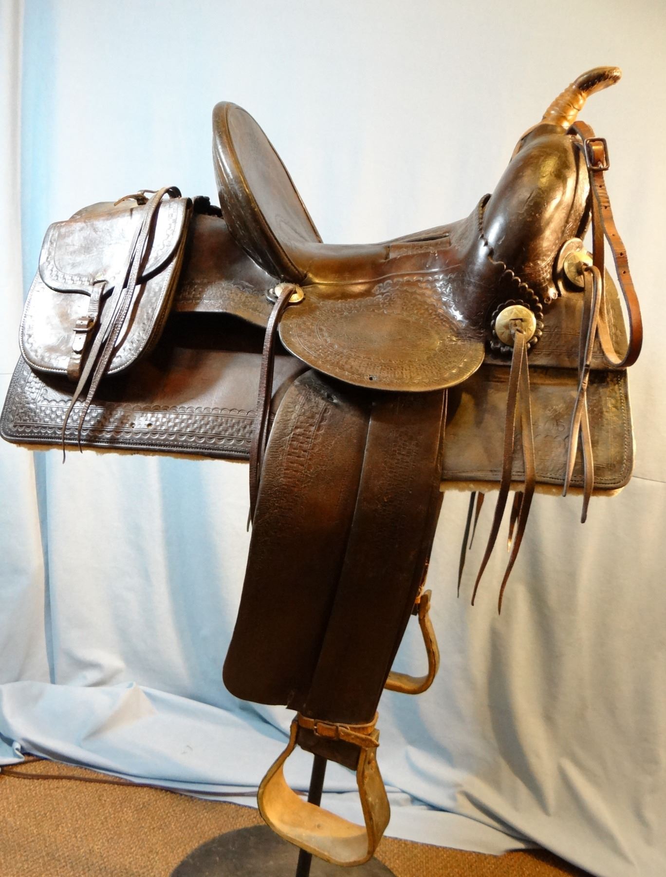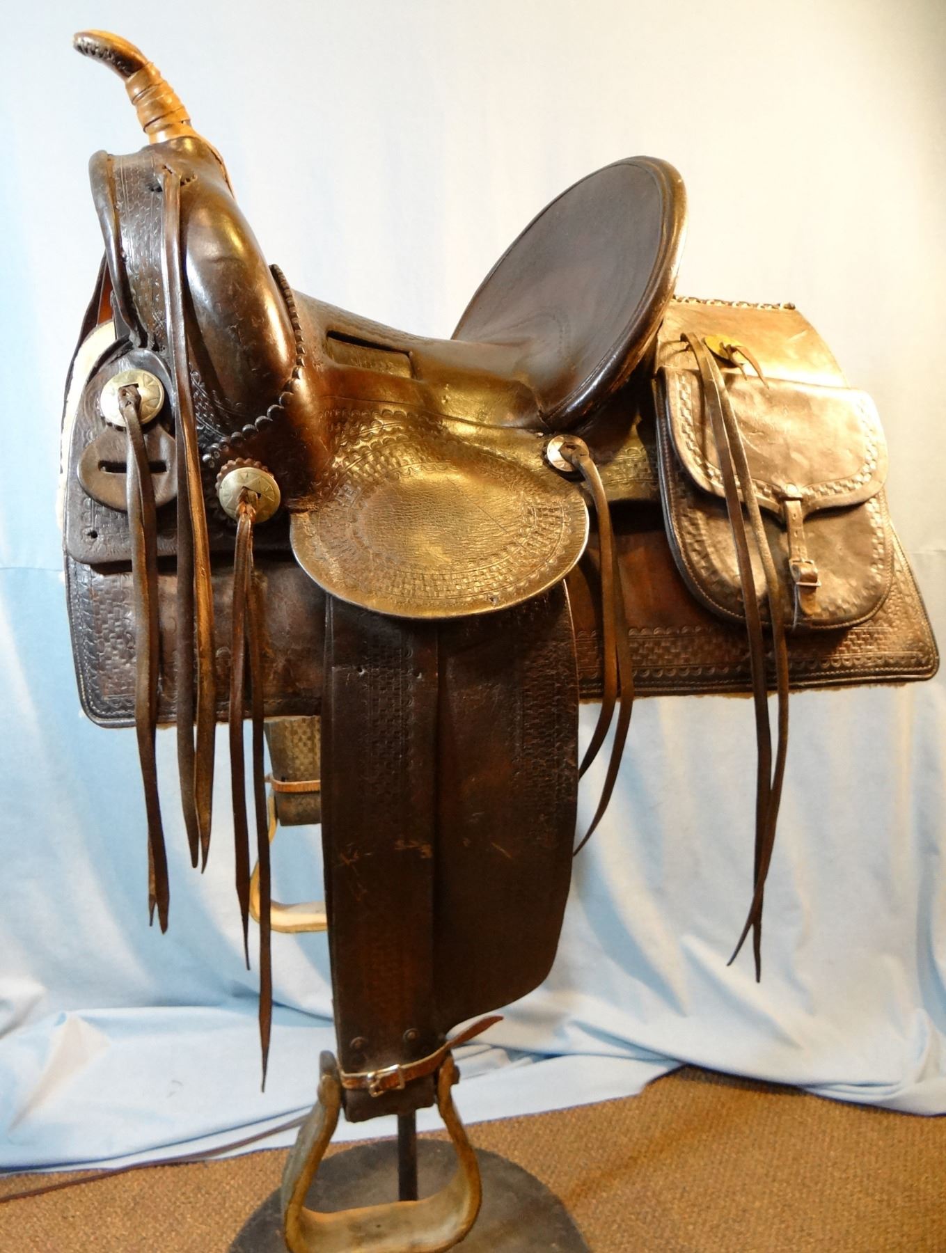 Coggshall, Miles City, MT high-back loop-seat saddle #406 w/saddle pockets, some restoration includi
