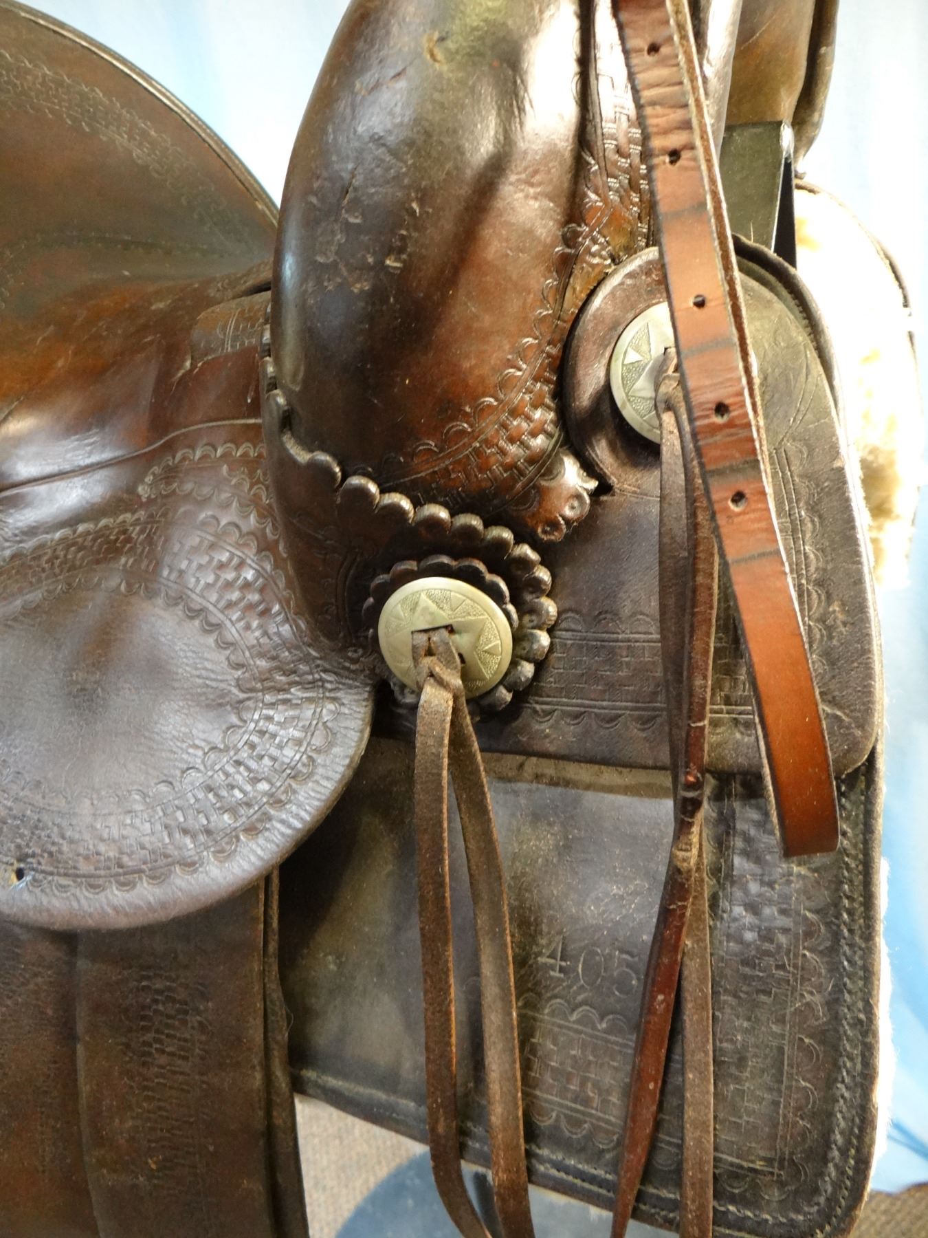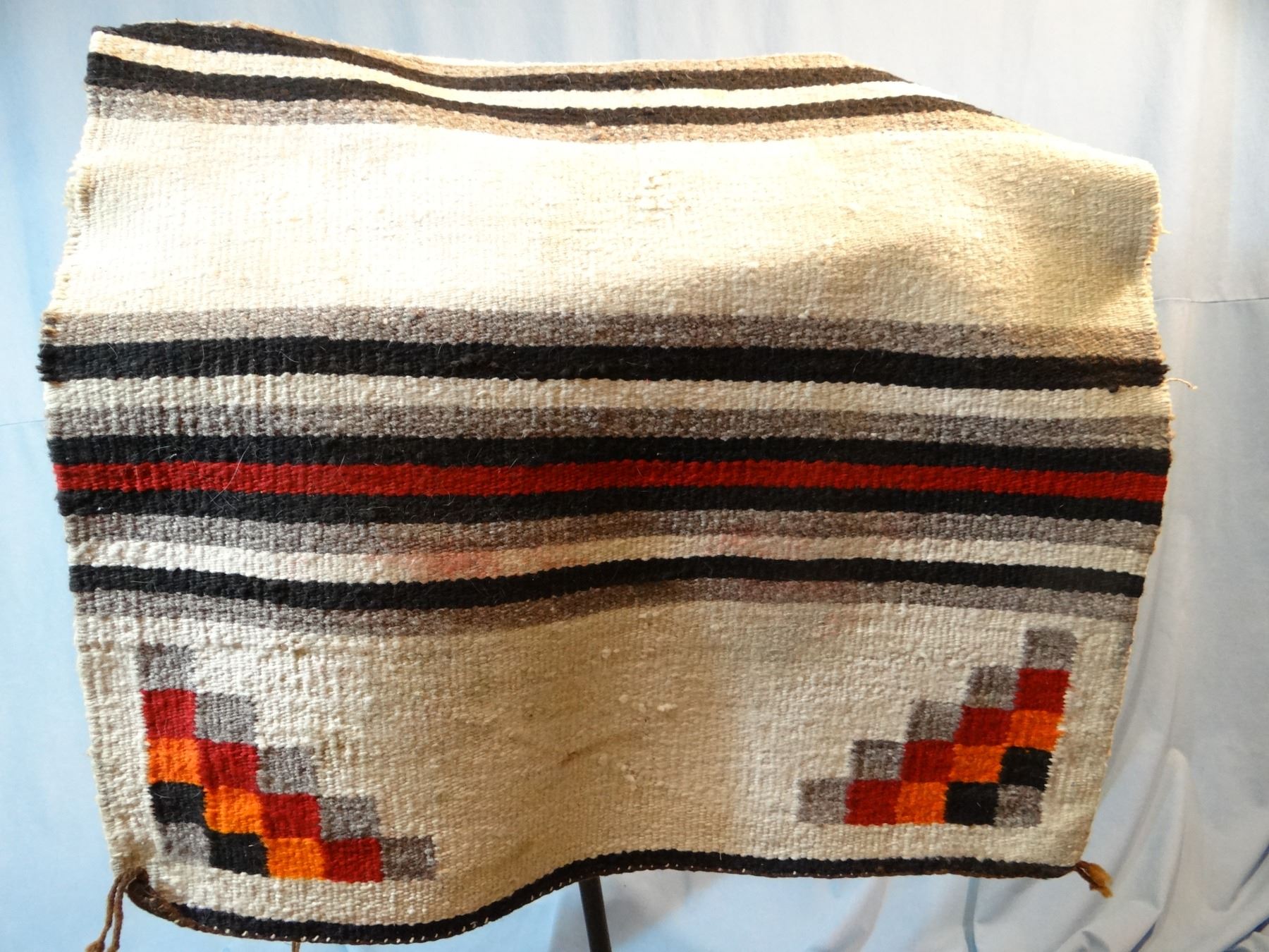 Coggshall, Miles City, MT high-back loop-seat saddle #406 w/saddle pockets, some restoration including new lining, excellent condition and Navajo saddle blanket, 31" x 62", shows cowboy wear