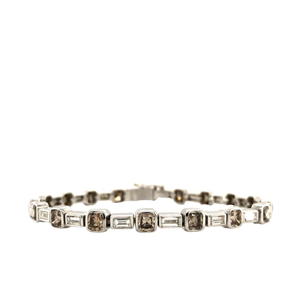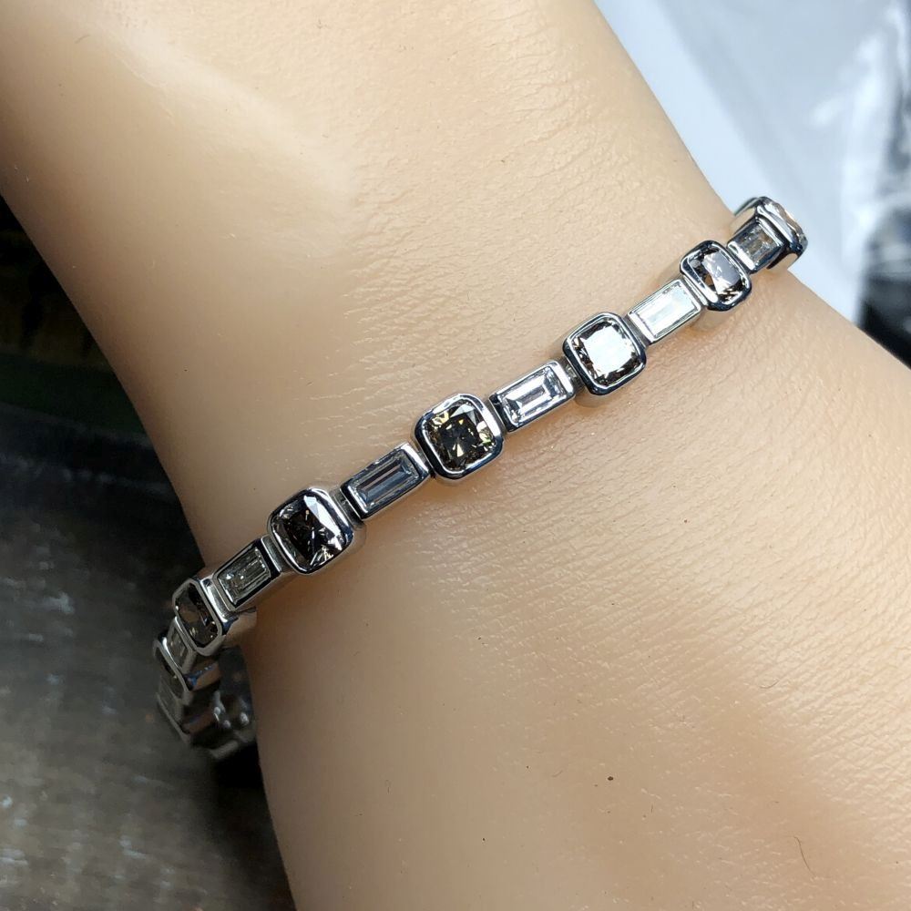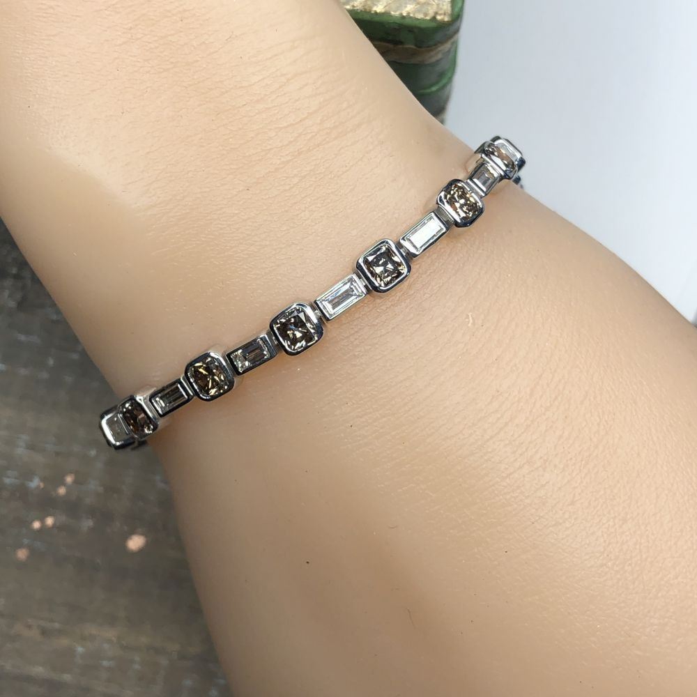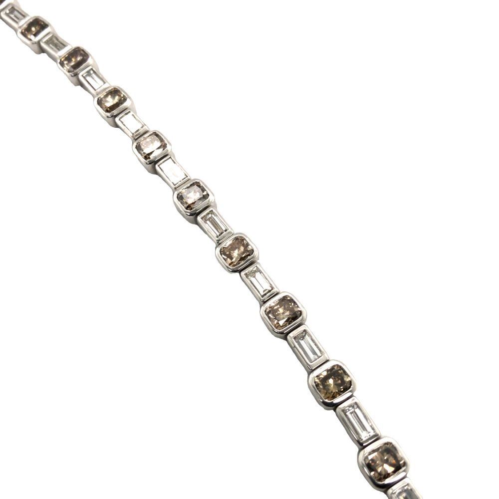 ADDITIONAL INFORMATION: This white gold bracelet is astounding in its simplicity. Bezel-set, cognac-colored brown diamonds and bezel-set, white baguette diamonds alternate on individual hinged links. The differentiating sizes and shapes gives the chic' staggered look top designers presented at this year's spring shows in Paris and Milan.& nbsp; The alternating of the dark brown and clear diamonds adds a popping contrast.& nbsp; The bracelet staggers from approximately 3.4mm to 5.5mm and has a hidden box clasp and a safety clip.
