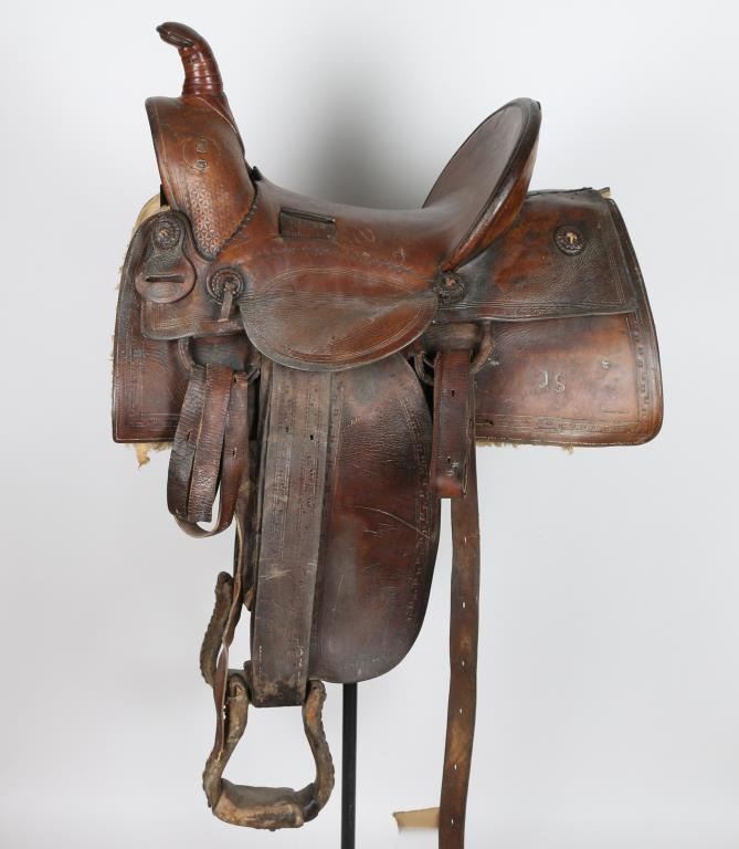 from Mile City, Montana. Smooth brown leather accented with geometric pattern, in fair condition. Shows age with 15" seat.