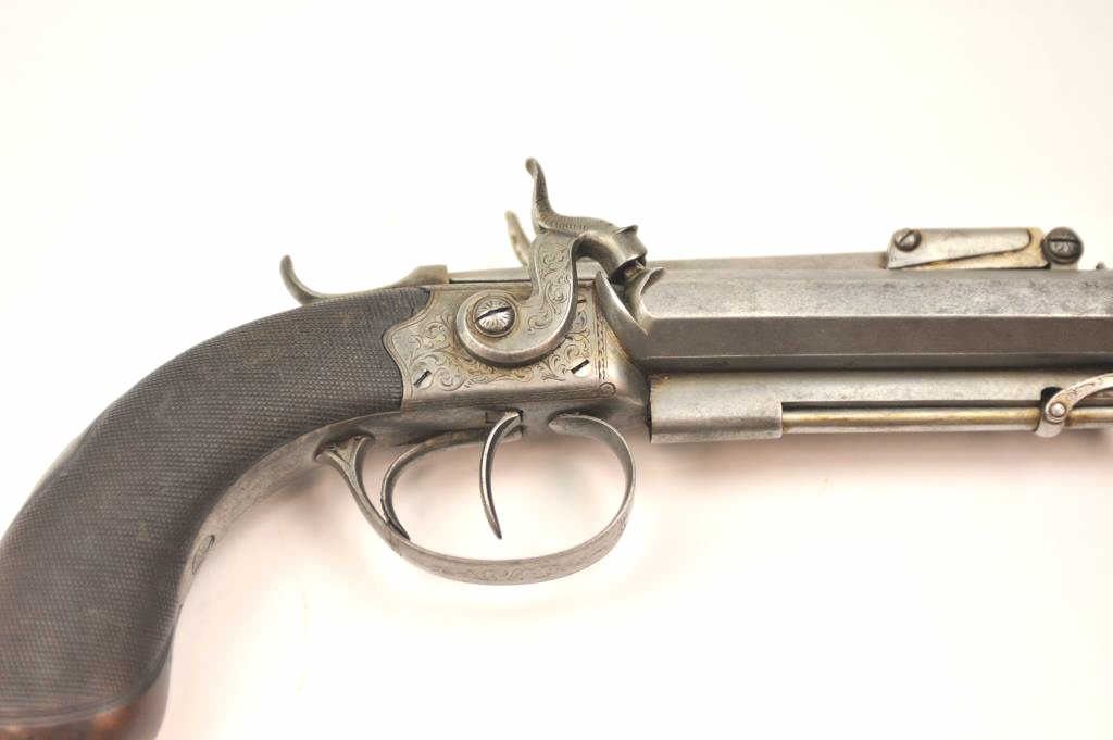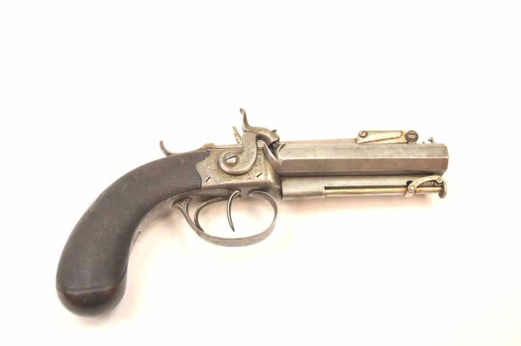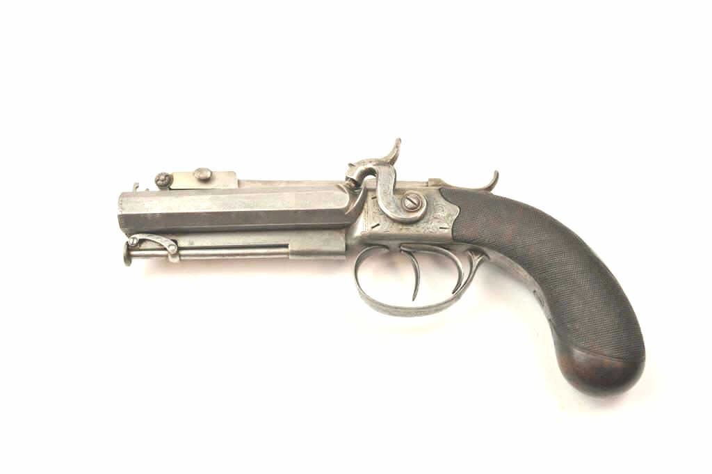 Cogswell double barrel percussion with a top-mounted spring bayonet marked, “COGSWELL 224 STRAND, LONDON” on the center rib. The pistol is nicely checkered and engraved with attached swivel ramrod. The pistol is 9 ½”in total length with barrels measuring 4 ¼” in .50 caliber smoothbore. The action works and the bayonet springs are weak and it does not snap out and lock tight. The pistol shows light cleaning but is N.R.A. good tovery good. Est.: $350-$700. (Antique).
