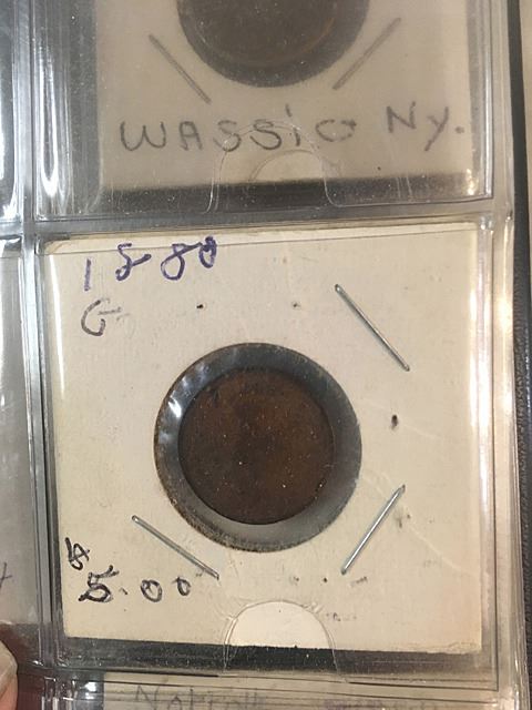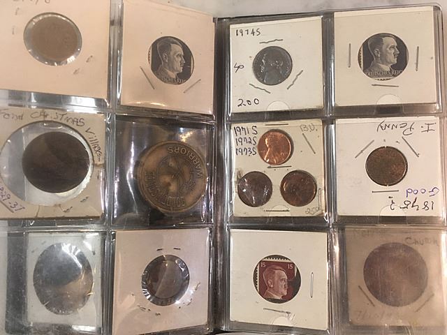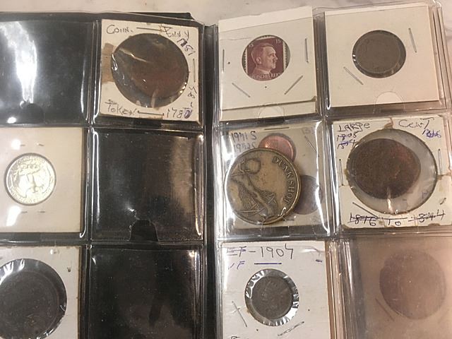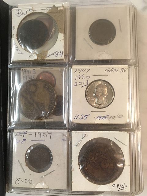 Coin album includes collection of mixed coins and tokens, 1957 Washington Quarter, 1926 Oregon Trail medallion, 1903 Indian Head Penny, large cent, and misc. coins. Being sold as found from the estate.