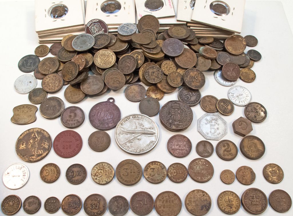 Over 100 tokens mostly drachms used as apothecary weights, with some maverick tokens mixed in the box. An eclectic collection.
