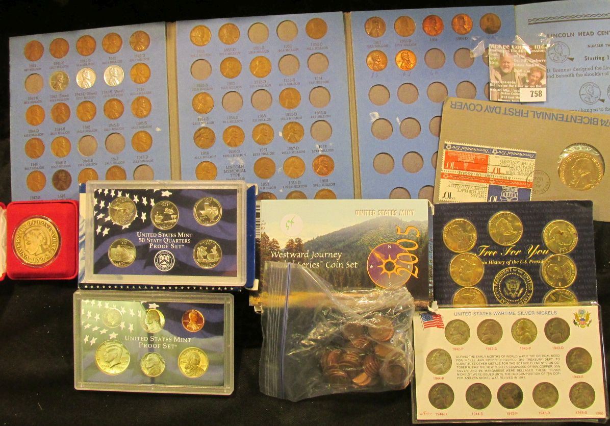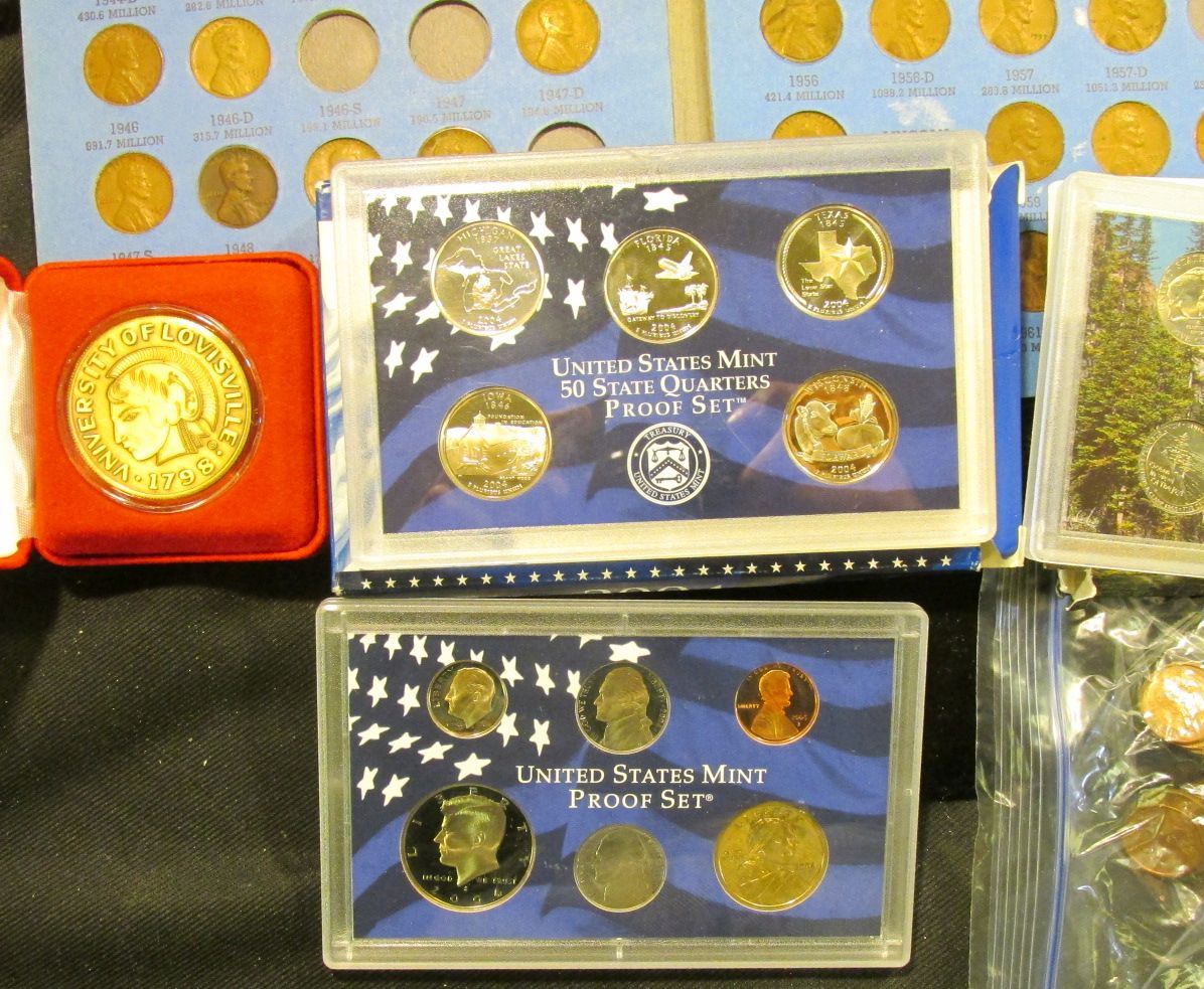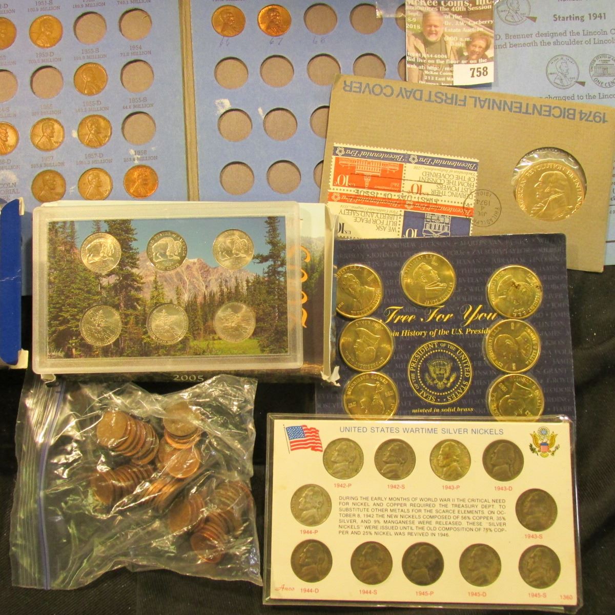 Coin Collection Lot Includes 2005 Westward Journey Nickel Series, Reader's Digest Presidential Medal Set, 1974 Bicentennial Medal First Day Cover, Bag Of Canadian Pennies, Silver War Nickel Set, Lincoln Head Cent Collection Starting With 1941, University Of Louisville Medal With Case, & 2004 Proof Set