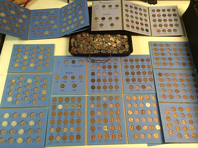 Large collection of Indian Head Pennies in early strong box (approx. 100), with silver dimes, Mercury dimes, silver wartime nickels, other silver coins, books; collections of Indian Head pennies, Lincoln head pennies and Buffalo nickels. All being sold for one monies, being sold as found, nobody has gone through them, just the way we found them at the estate.