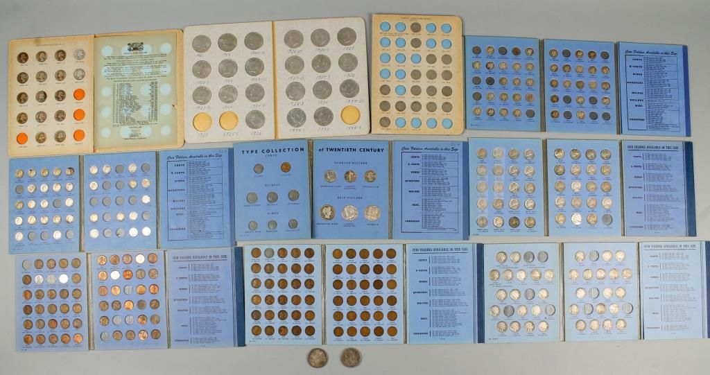 Including: dimes, nickels, and silver dollars. Lincoln head cent 1909-1940, missing the 1909s. Lincoln head cent starting 1941-1960, missing various dates Roosevelt dime dates 1946-1961, missing various dates. Mercury head dime 1916-1945, missing various dates. Buffalo nickel 1913-1938, missing various dates. Jefferson nickel collection starting 1938, missing various dates. Type collection of Twentieth century United States coins, missing various dates. Liberty nickel album 1866-1912, missing various dates. General silver dollar album 1921-1935 missing various dates. Washington quarter album 1932-1945, missing various dates. One dollar coin 1883 and one dollar coin 1884.