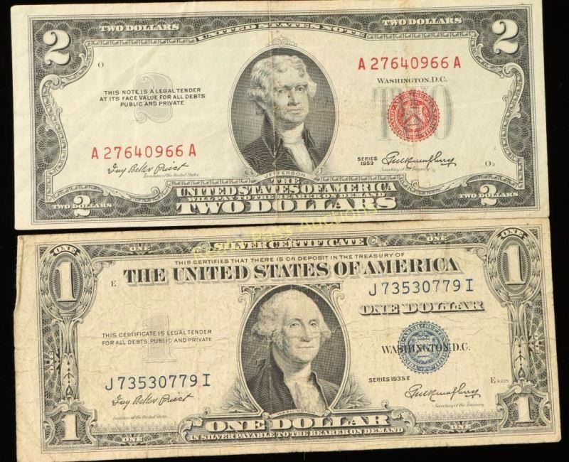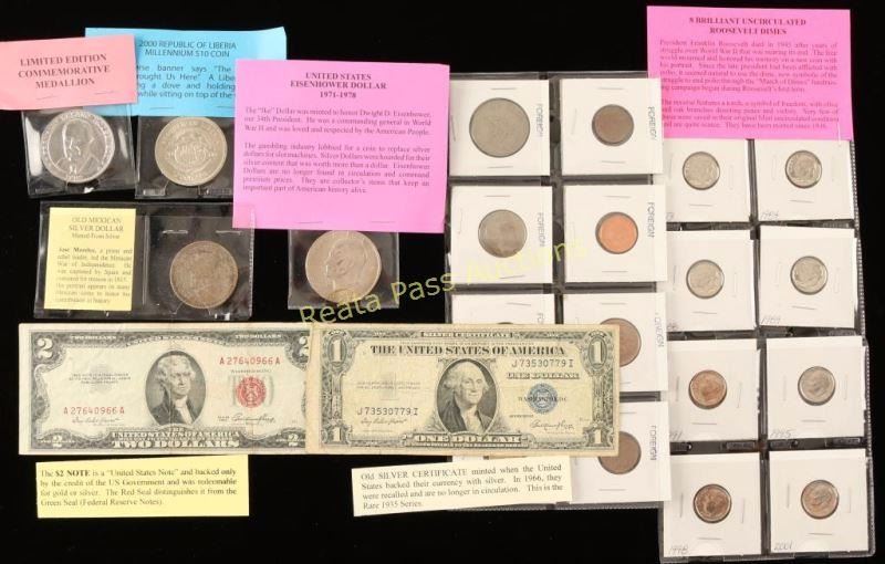 Including; 2000 Republic of Liberia Millennium $10 coin, Limited Edition Commemorative Roosevelt Medallion, 1935 Silver Certificate, $2 bill, Old Mexican Silver Dollar, Eisenhower Dollar, 8 Foreign Coins, 8 Brilliant Uncirculated Roosevelt Dimes.