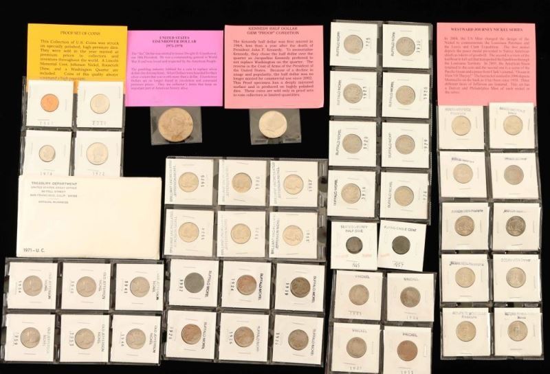 Including; Flying Eagle Cent 1857, Seated Liberty Half Dime 1865, (4) Victory Nickels, (14) Buffalo Nickels, (6) Brilliant Uncirculated Jefferson Nickels, (6) Old Jefferson Nickels, Westward Journey Nickel Series (10), US Treasury Mint Set 1971 Uncirculated, US Eisenhower Dollar 1972, Kennedy Half Dollar Gem Proof Condition 1980, and a Proof set of Coins (4).