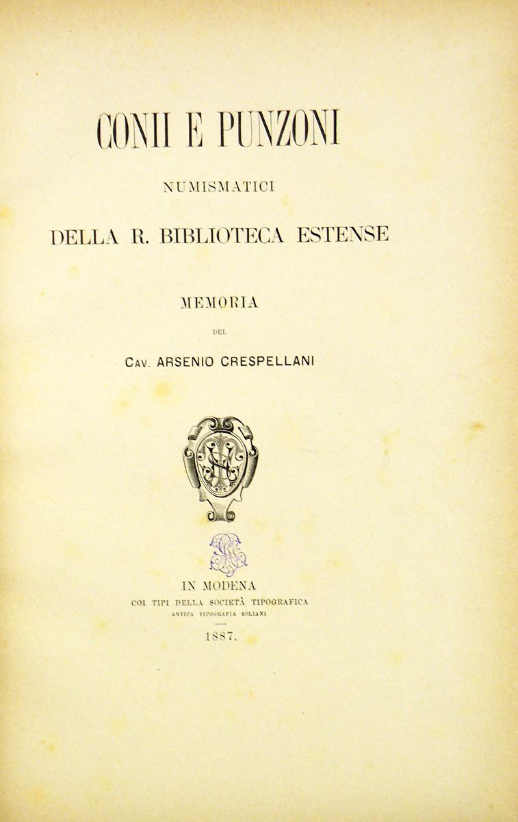 Crespellani, Arsenio. CONII E PUNZONI NUMISMATICI DELLA R. BIBLIOTECA ESTENSE. Modena, 1887. Tall 4to, contemporary blue cloth and mottled boards; printed paper spine label. (2), lix, (1), 99, (1) pages; 2 fine plates. Printed book label with the initials M.P. surmounted by a crown. Fine. The second plate depicts a number of dies for Islamic coins. Gnecchi 219. Not in Mayer.