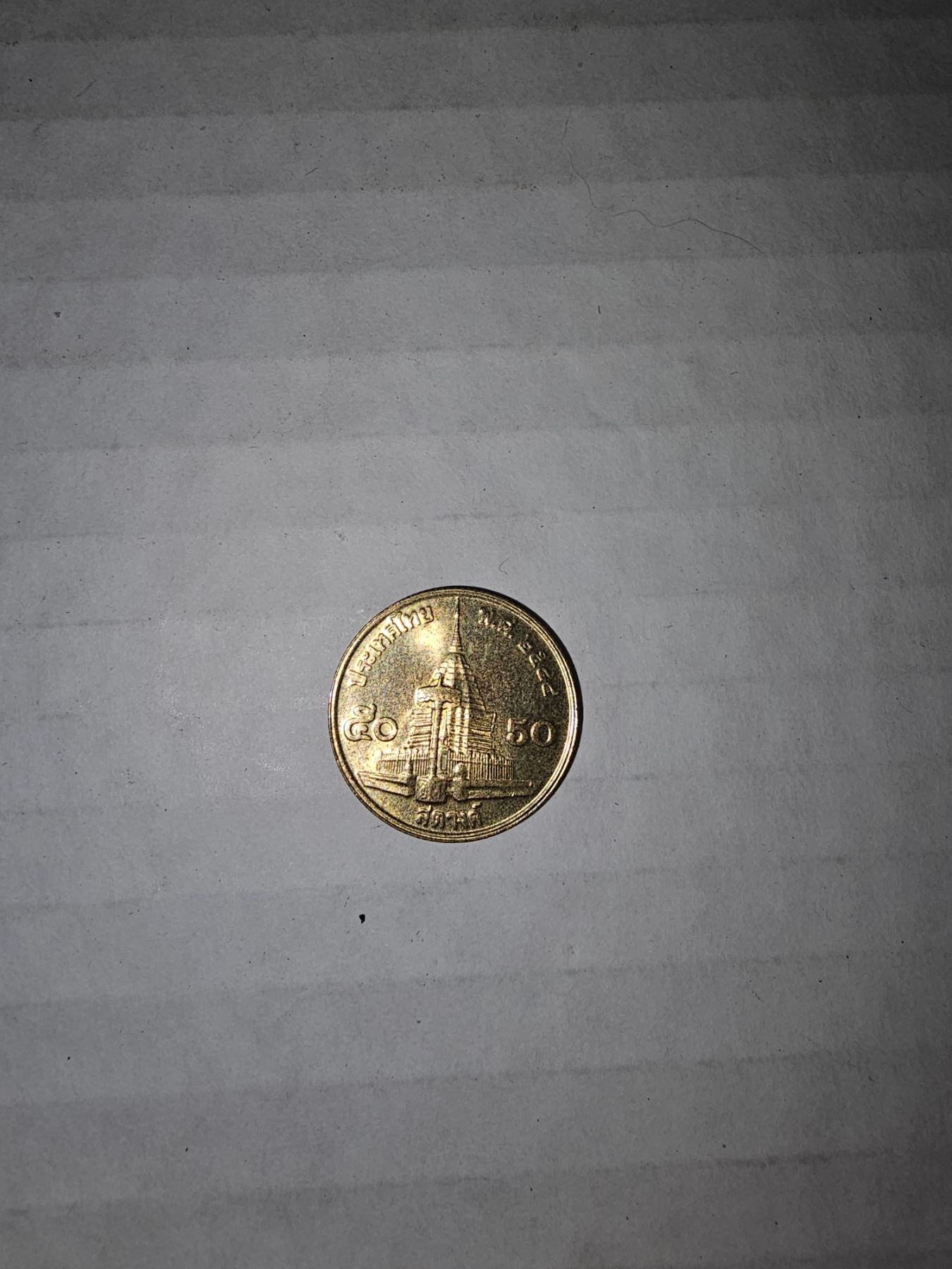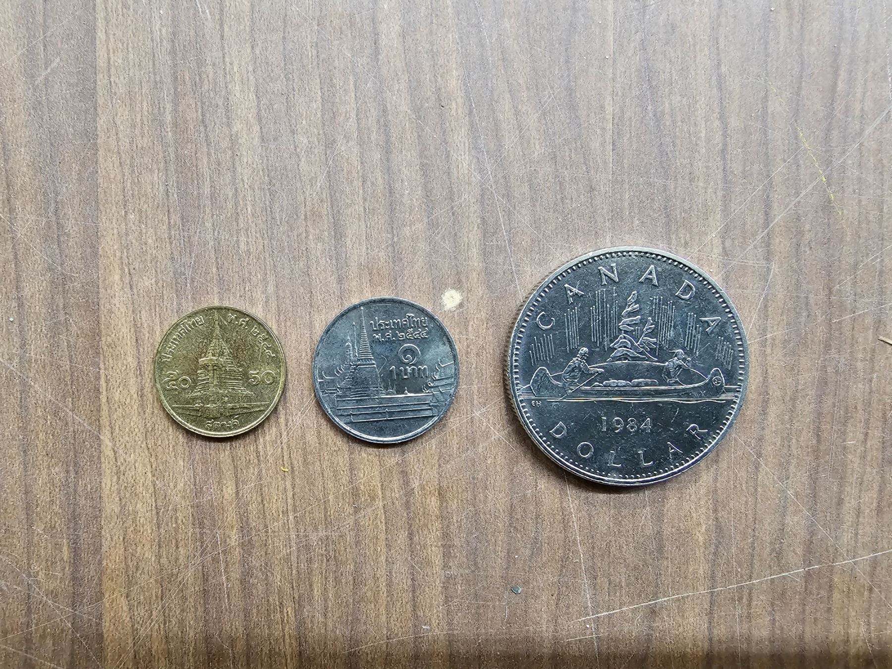 2001 Thailand 50 satang coin, 2001 Thailand 1 baht coin & 1984 Canada 1 dollar coin.
