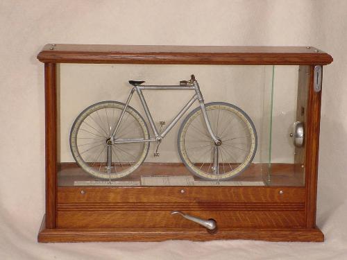 "THE BICYCLE" trade stimulator. Manufactured by Sun Manufacturing in 1898. Professionally restored to perfection. Detailed in glass/oak case. Includes payout schedule.